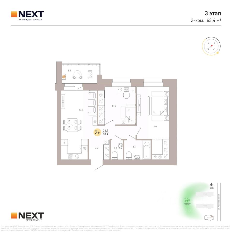 Преимущества жизни в ЖК NEXT на Площади Партизан: - Кирпичные дома - Близость естественного природного массива - Развитая инфраструктура - Удобная транспортная доступность - Авторские планировки - Индивидуальное отопление - Встроенная система ''тёплый пол'' - Отапливаемая лоджия с панорамным остеклением - Высота потолков от 2,7 до 3 м. - В квартирах предусмотрены кухни-гостиные, ниши для шкафов, гардеробные, мастер-спальни.