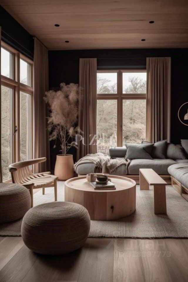 Продуманная и удобная планировка предполагает наличие мастер-спальни (14,5 м2) со своим с/у (4 м2) и гардеробной (3,5 м2), просторной детской комнаты (13 м2) с гардеробной (3,5 м2) и ванной комнатой (4,7 м2), гостевой спальней (13 м2), которую при необходимости можно адаптировать под кабинет. Предусмотрен гостевой с/у (5 м2), просторная прихожая (12,5 м2), помещение котельной с отдельным входом (5 м2). Панорамное остекление наполняет каждую комнату светом. Просторная кухня- гостиная (44 м2), имеет выход на террасу 15 м2, которую при желании можно легко увеличить.