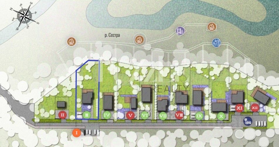 Дом расположен в клубном посёлке ''Ветви Репино'' всего на 11 домовладений. Поселок со всех сторон окружен лесом. Участок выходит на берег реки Сестры. На другом берегу расположен государственный охраняемый заказник. Высокий уровень приватности и безопасности.
