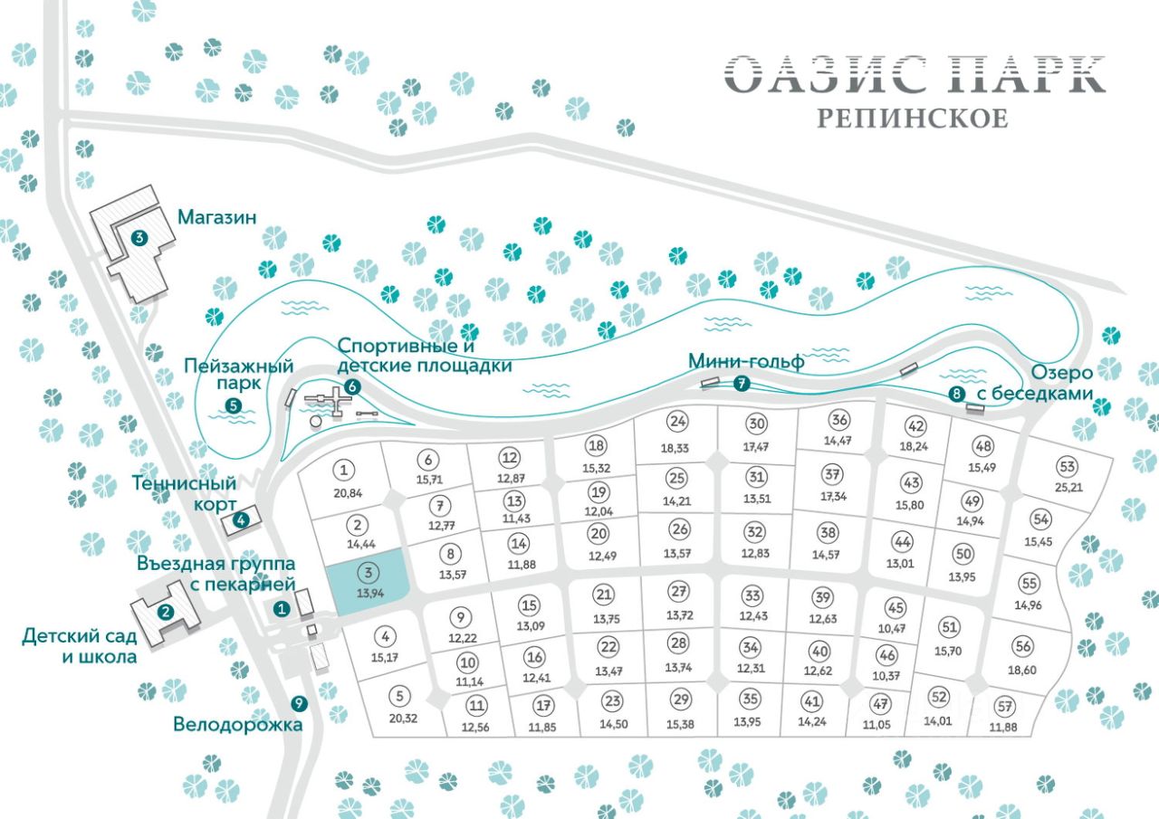Коттеджный посёлок ''Оазис Парк Репинское'' первоклассная инфраструктура посёлка обеспечит идеальные условия и для отдыха в выходные и праздничные дни, так и для круглогодичного проживания: Школа и детский сад в шаговой доступности Живописный парк 4 Га с теннисным кортом, велосипедными и прогулочными дорожками Благоустроенное озеро с беседкой Ресторан с террасой Фитнес с бассейном и СПА Химчистка Фруктовый сад и огород Гастрономическая лавка с пекарней Зарядка для электрокаров Лаундж-зона с террасой и баром Детская зона с развивающими площадками Пункт охраны Экотропа к реке Сестре Гостевая парковка Консьерж-сервис 24/7 Площадка для мини-гольфа Спортивная площадка для взрослых и детей