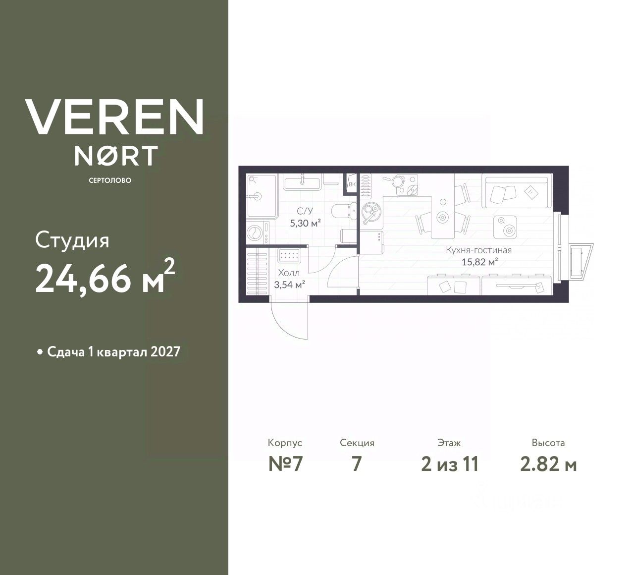 1-комн. квартира-студия от застройщика в Veren Nort Сертолово на 2 этаже. Квартира без отделки, новый владелец может сделать ремонт по своему проекту. Общая площадь: 24.66 кв.м., площадь гостиной 15.82 кв.м., из которых 5 кв.м. выделено под кухонную зону. Все окна выходят на одну сторону. В квартире один совмещенный санузел. Высота потолков 2.82 м.