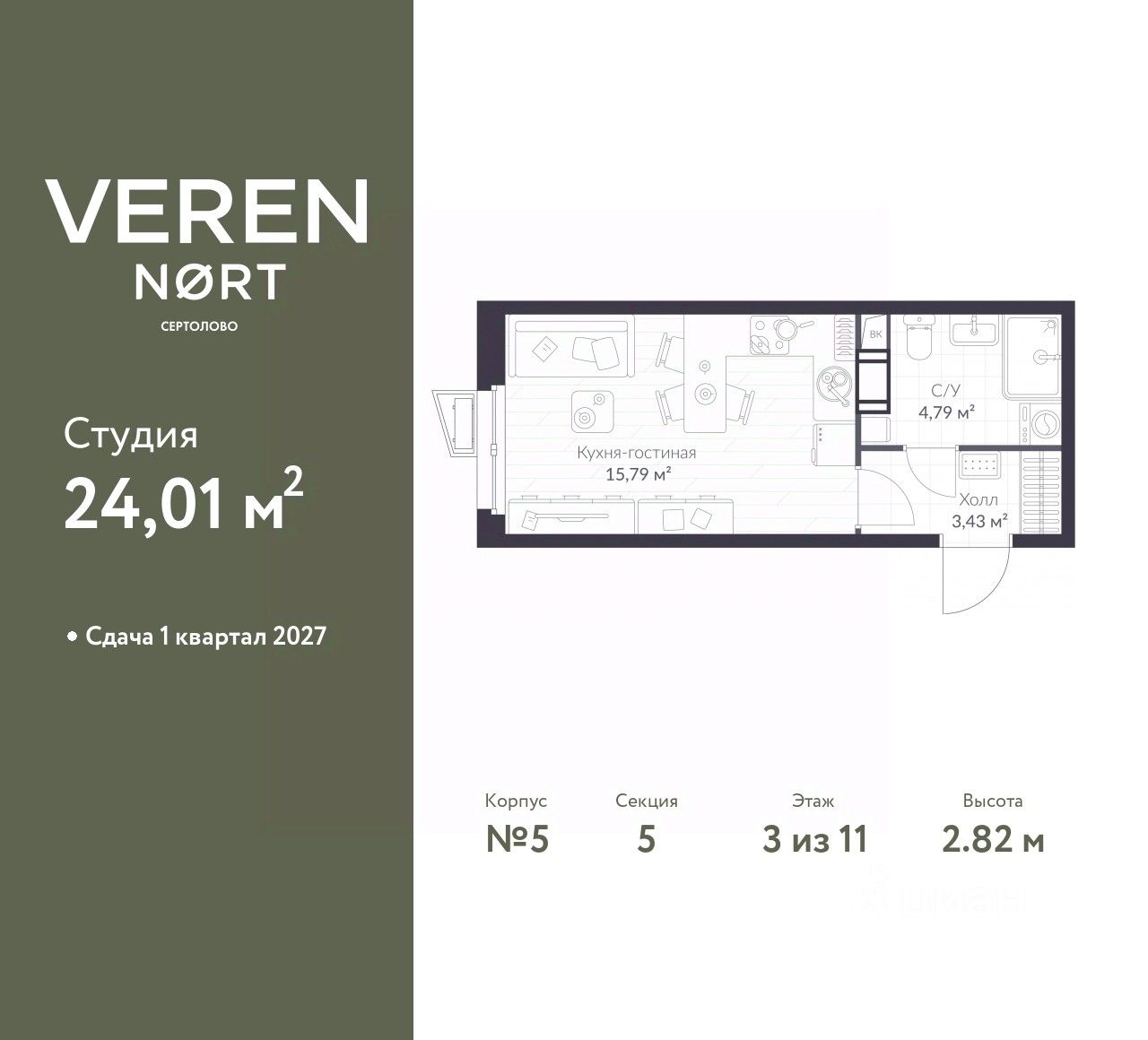 Просторная однокомнатная квартира-студия в Veren Nort Сертолово на 3 этаже. Квартира без отделки, полностью готова к ремонту. Общая площадь: 24.01 кв.м., площадь гостиной 15.79 кв.м., из которых 5 кв.м. выделено под кухонную зону. Все окна выходят на одну сторону. В квартире один совмещенный санузел. Высота потолков 2.82 м.