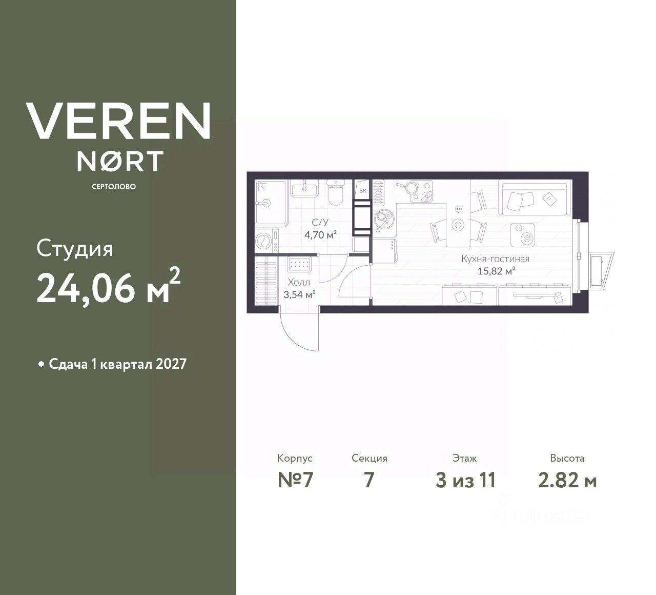 Однокомнатная квартира-студия в Veren Nort Сертолово на 3 этаже. Квартира без отделки, полностью готова к чистовой отделке и дальнейшему ремонту. Общая площадь: 24.06 кв.м., площадь гостиной 15.82 кв.м., из которых 5 кв.м. выделено под кухонную зону. Все окна выходят на одну сторону. В квартире один совмещенный санузел. Высота потолков 2.82 м.