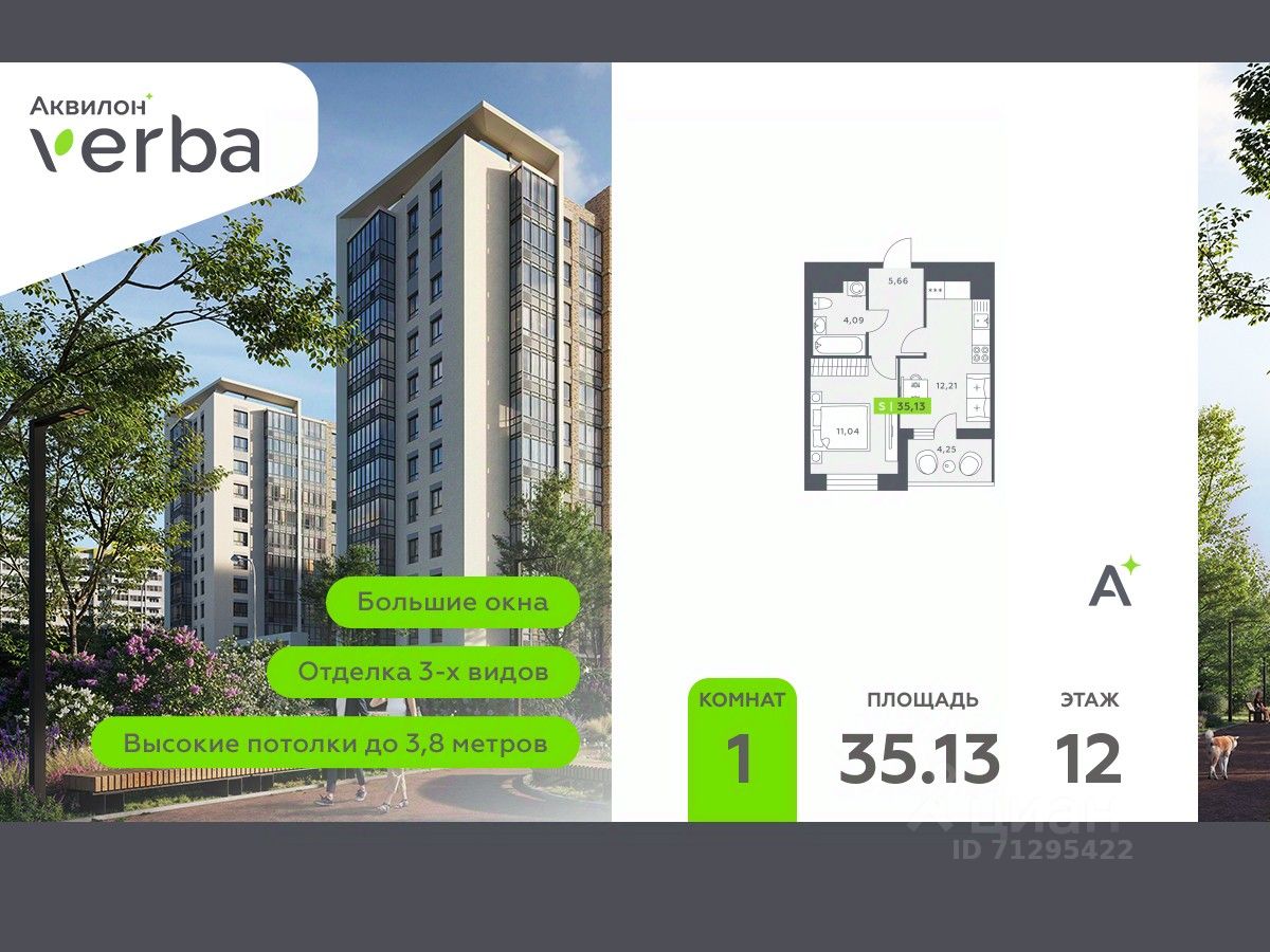 1-комн. квартира от застройщика с первичной отделкой в ЖК ''Аквилон VERBA'' на 12 этаже. Общая площадь: 35.13 кв.м., жилая: 11.04 кв.м., площадь просторной кухни-столовой: 12.21 кв.м. Все окна выходят на одну сторону. В квартире одна лоджия, один совмещенный санузел. Высота потолков 2.72 м.