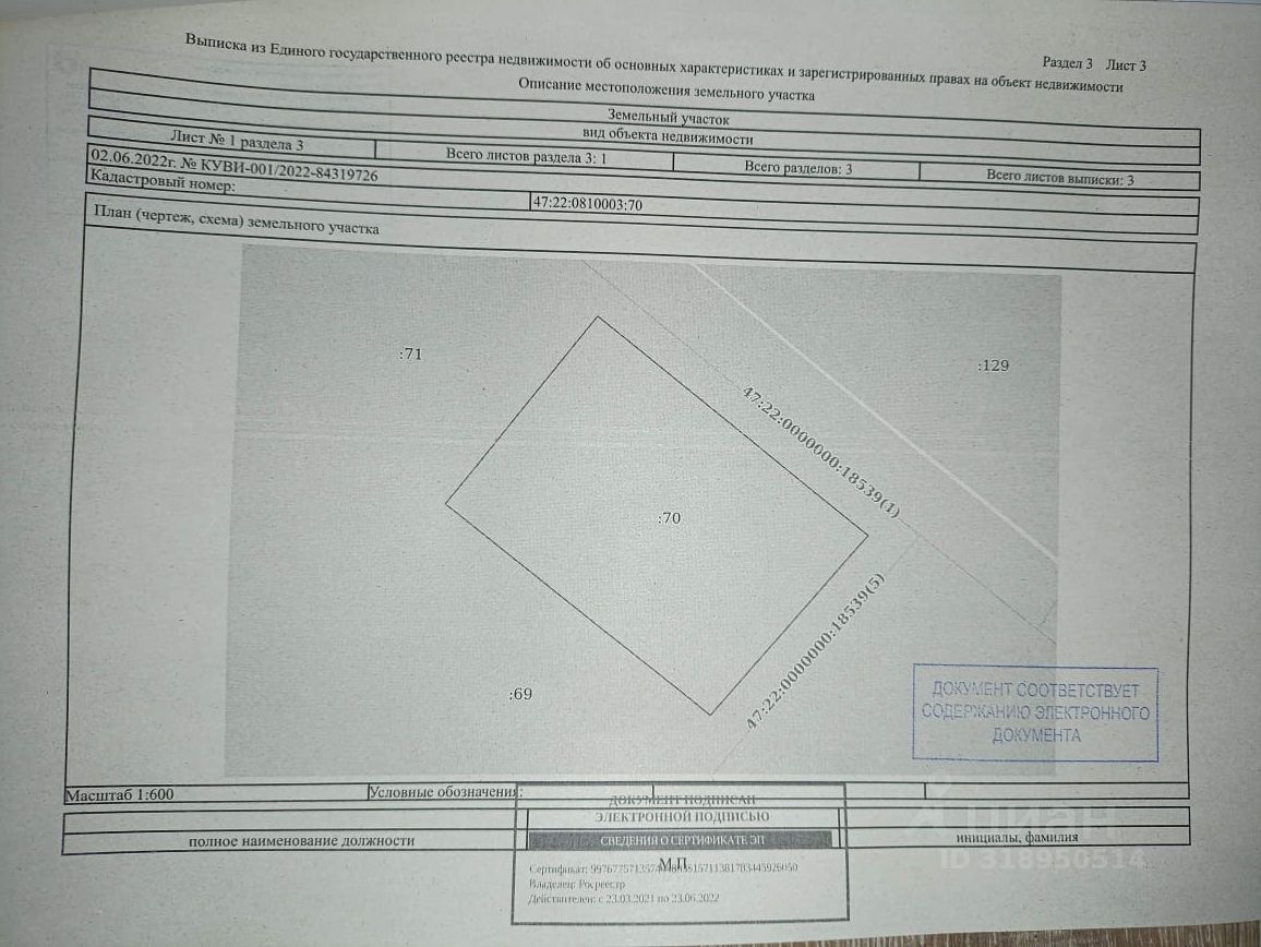 КН 47:22:0810003:70 , БЕЗ обременений, подходит под ипотеку и строительство.