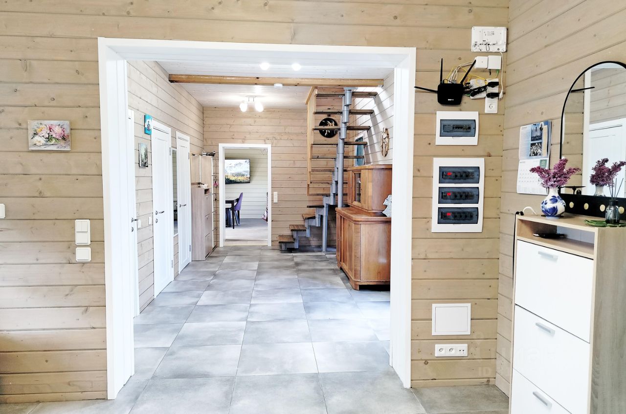 Планировка первого этажа включает в себя просторную кухню-столовую, гостиную, кабинет (или спальню), санузел и бойлерную. На всём первом этаже тёплые полы! На втором этаже располагаются холл с выходом на открытую террасу, 3 спальни и санузел. Дом построен из качественного бруса и отделан сайдингом. В доме выполнено утепление.