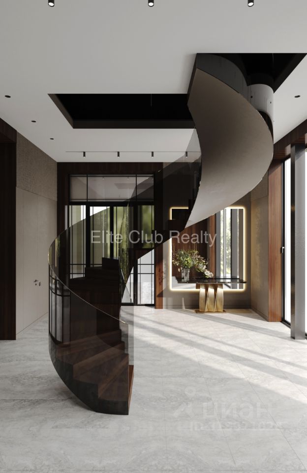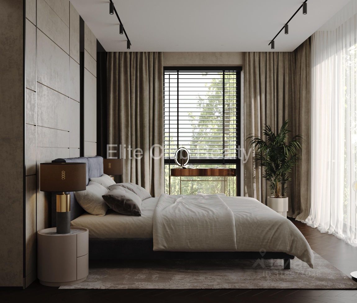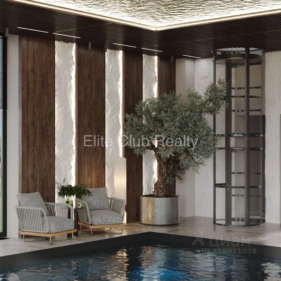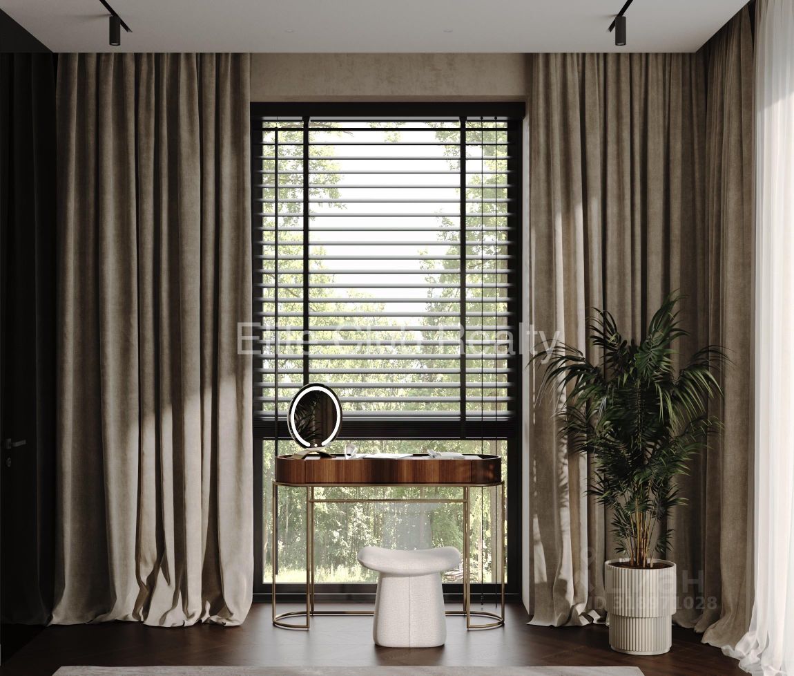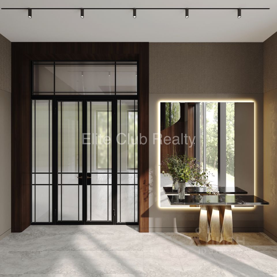 Планировка: * 1 этаж: холл с 4метровыми потолками, эффектная винтовая лестница, кухня с премиальной встроенной техникой и мраморным островом, обеденная зона на 12 персон, гостевая спальня с санузлом, закрытый бассейн с панорамным остеклением и выходом на террасу. * 2 этаж: холллаунж, главная спальня (с ванной и гардеробом), 3 гостевых спальни (одна с террасой), функциональный и элегантный дизайн в нейтральных тонах. * Удобства: лифт, парящая лестница.