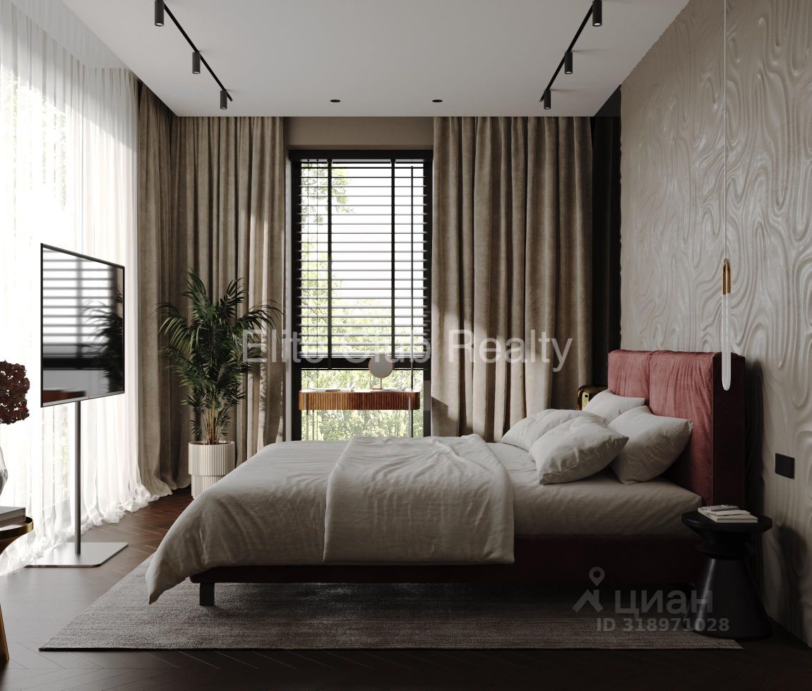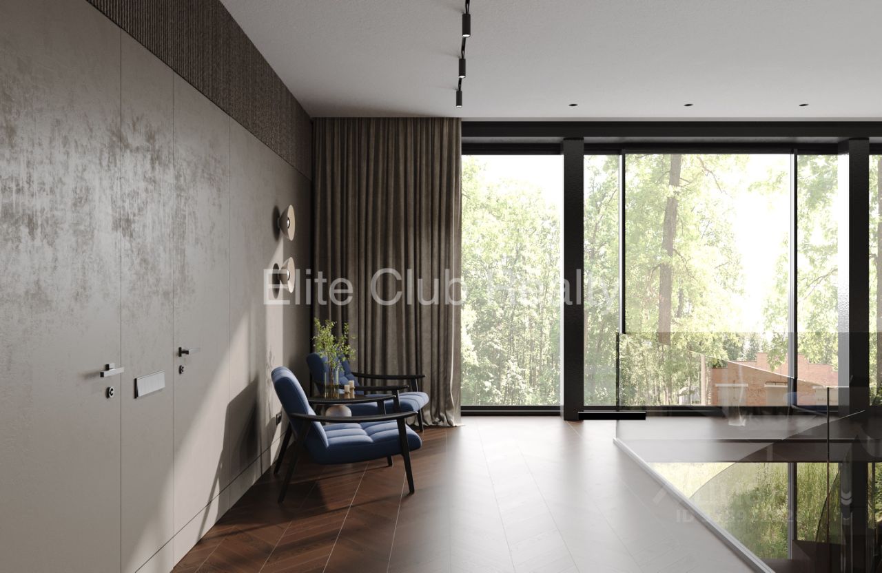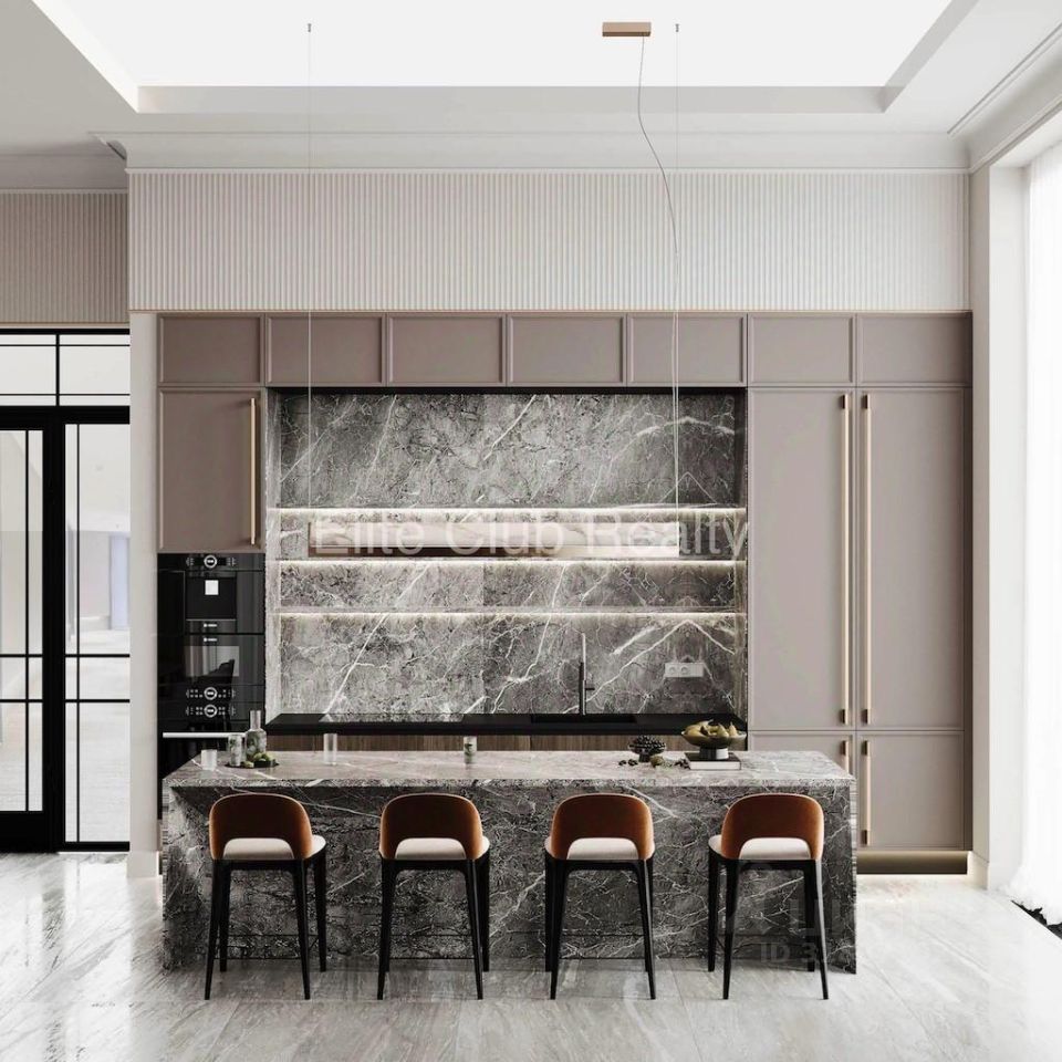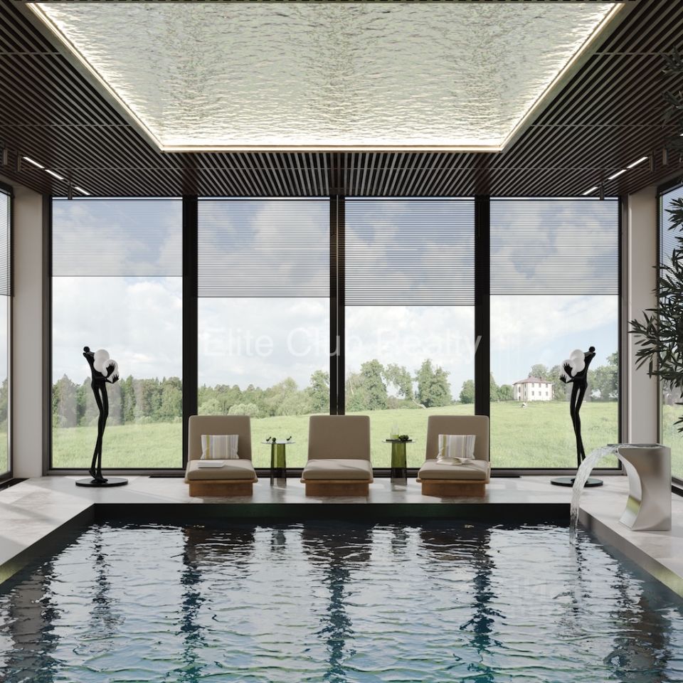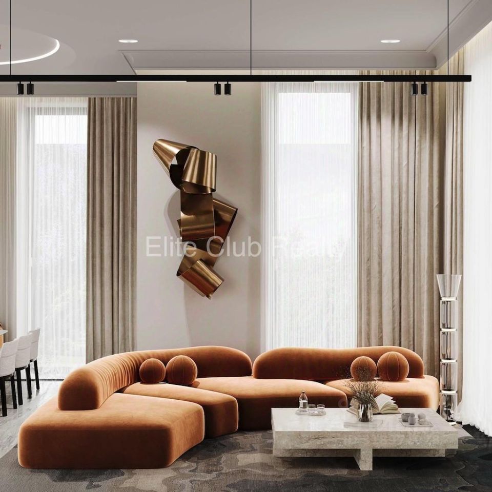 Планировка: * 1 этаж: холл с 4метровыми потолками, эффектная винтовая лестница, кухня с премиальной встроенной техникой и мраморным островом, обеденная зона на 12 персон, гостевая спальня с санузлом, закрытый бассейн с панорамным остеклением и выходом на террасу. * 2 этаж: холллаунж, главная спальня (с ванной и гардеробом), 3 гостевых спальни (одна с террасой), функциональный и элегантный дизайн в нейтральных тонах. * Удобства: лифт, парящая лестница.
