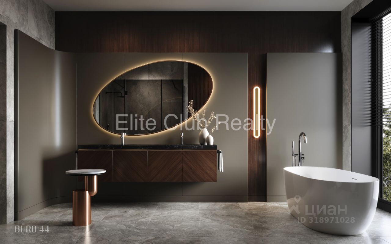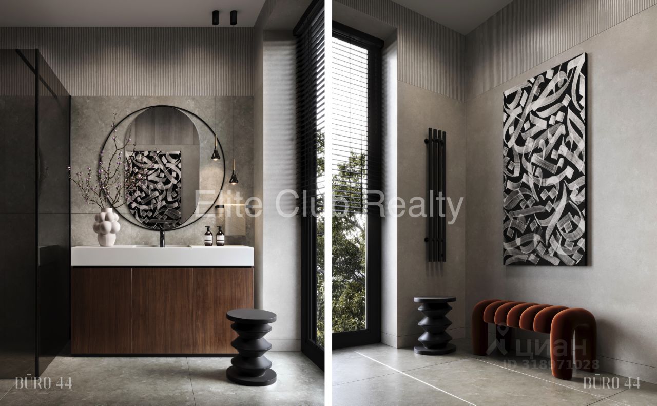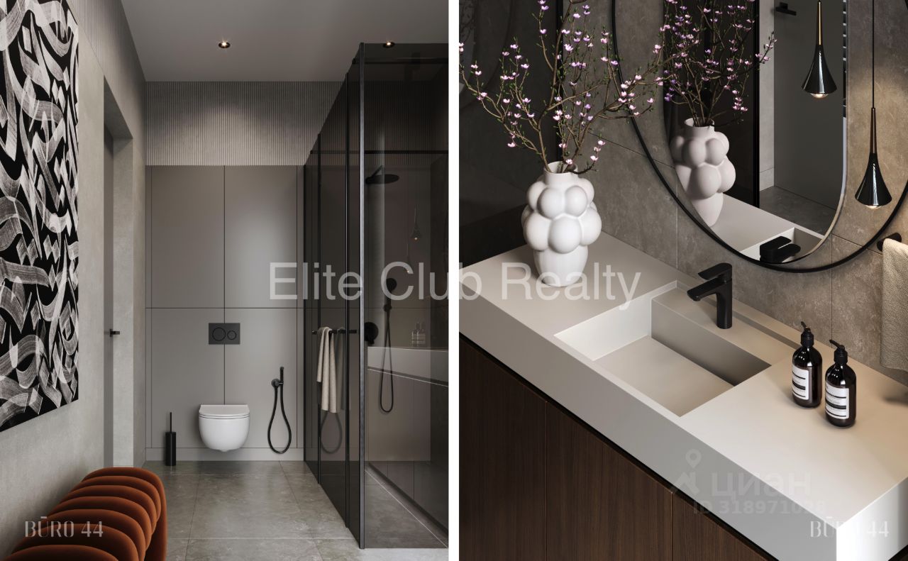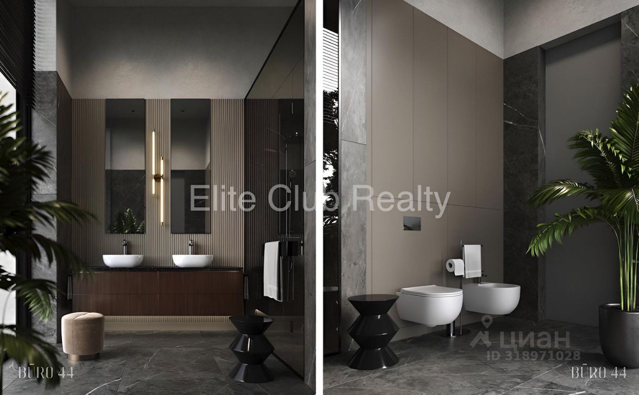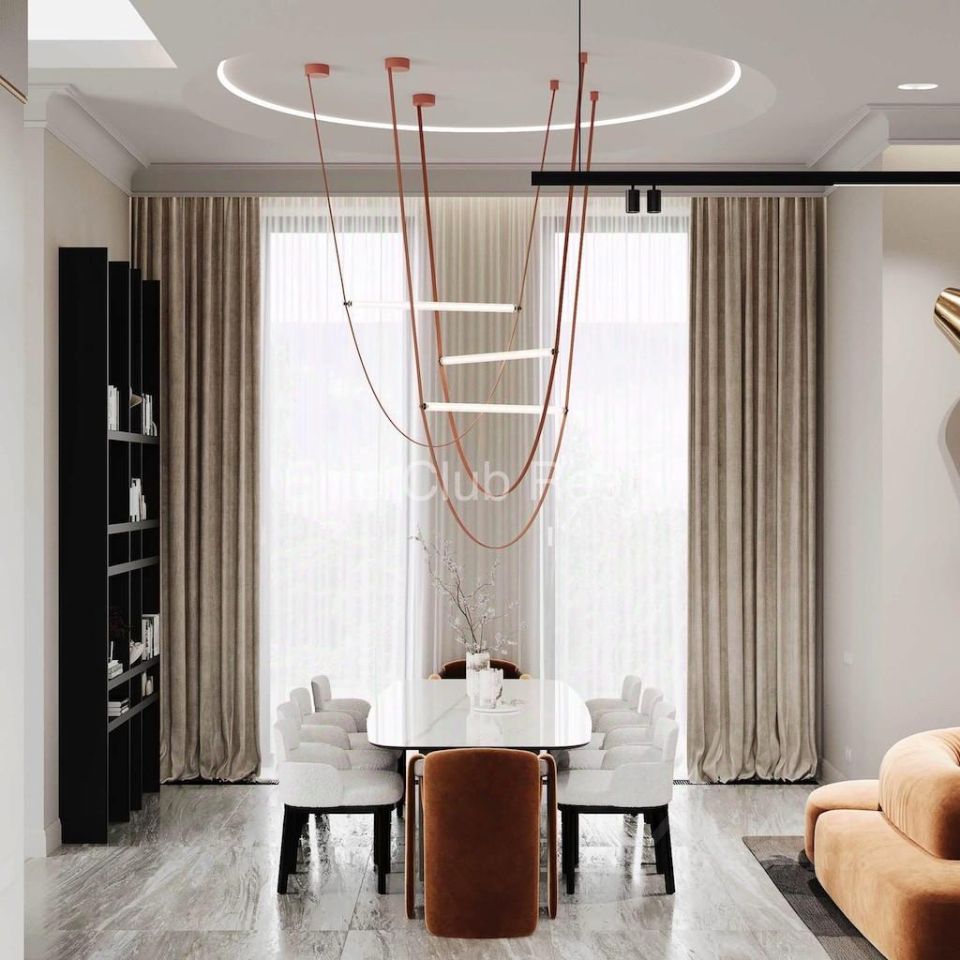 Планировка: * 1 этаж: холл с 4метровыми потолками, эффектная винтовая лестница, кухня с премиальной встроенной техникой и мраморным островом, обеденная зона на 12 персон, гостевая спальня с санузлом, закрытый бассейн с панорамным остеклением и выходом на террасу. * 2 этаж: холллаунж, главная спальня (с ванной и гардеробом), 3 гостевых спальни (одна с террасой), функциональный и элегантный дизайн в нейтральных тонах. * Удобства: лифт, парящая лестница.
