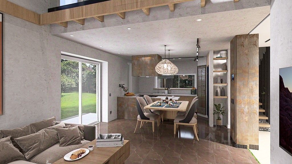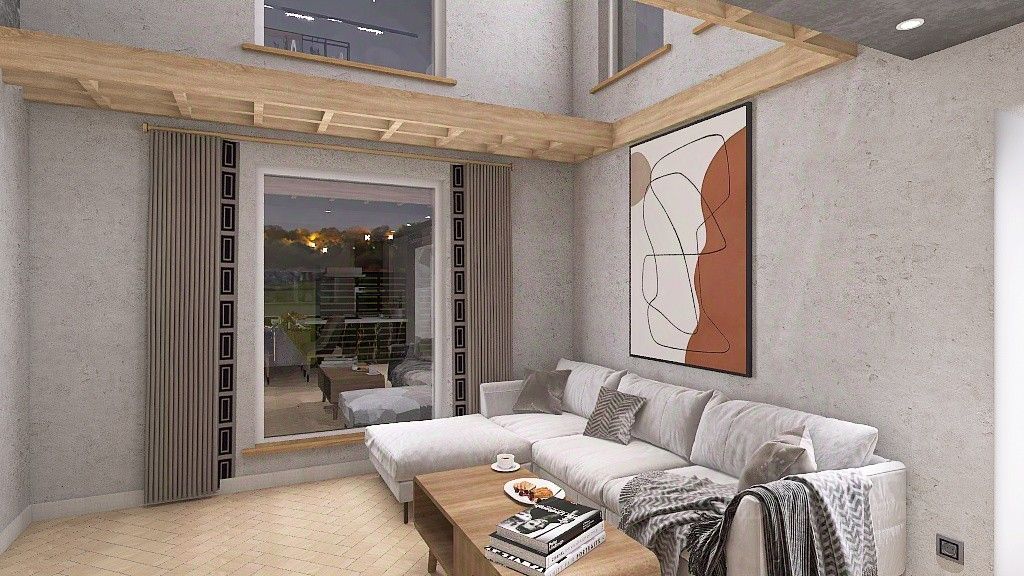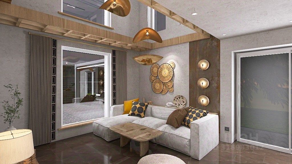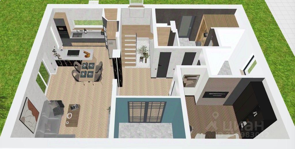 Внутри коттеджа расположены: + На 1-м этаже: кухня, просторная гостиная с ПАНОРАМНЫМИ окнами и выходом на террасу , а также спальня, с/у, ванная комната , по желанию можно установить сауну, технические помещения, + На 2-м этаже: 2 спальни и с/у, гардеробная, веранда (выход на балкон), + сделана винтовая лестница на крышу, где можно расположить лаунж - зону!