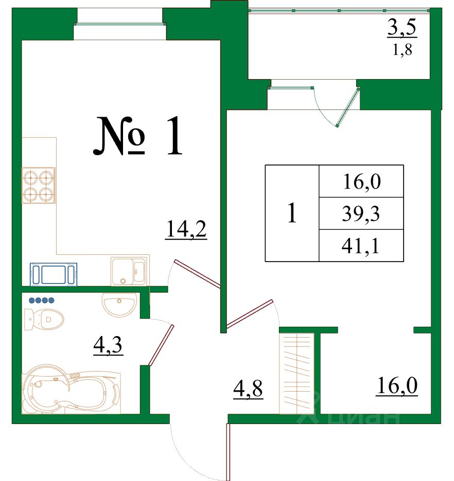 Общая площадь41,1 м2