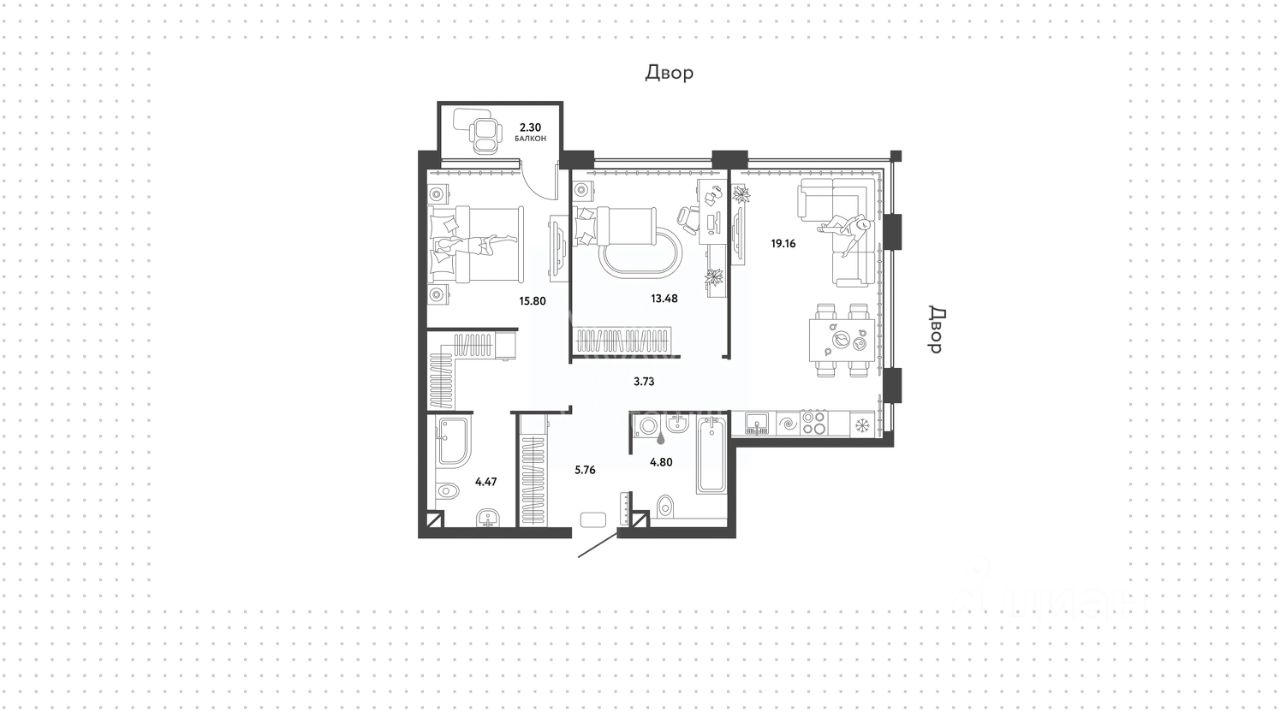 Просторная квартира с двумя спальнями общей площадью 69 м² в квартале бизнес-класса WOW на берегу Москвы-реки. Квартира с чистовой отделкой расположена на втором этаже в корпусе 6. Планировка: угловая кухня-гостиная, мастер-спальня со своей гардеробной, ванной комнатой и выходом на балкон, вторая спальня, ванная комната, прихожая. Окна выходят на две стороны с видами во двор.