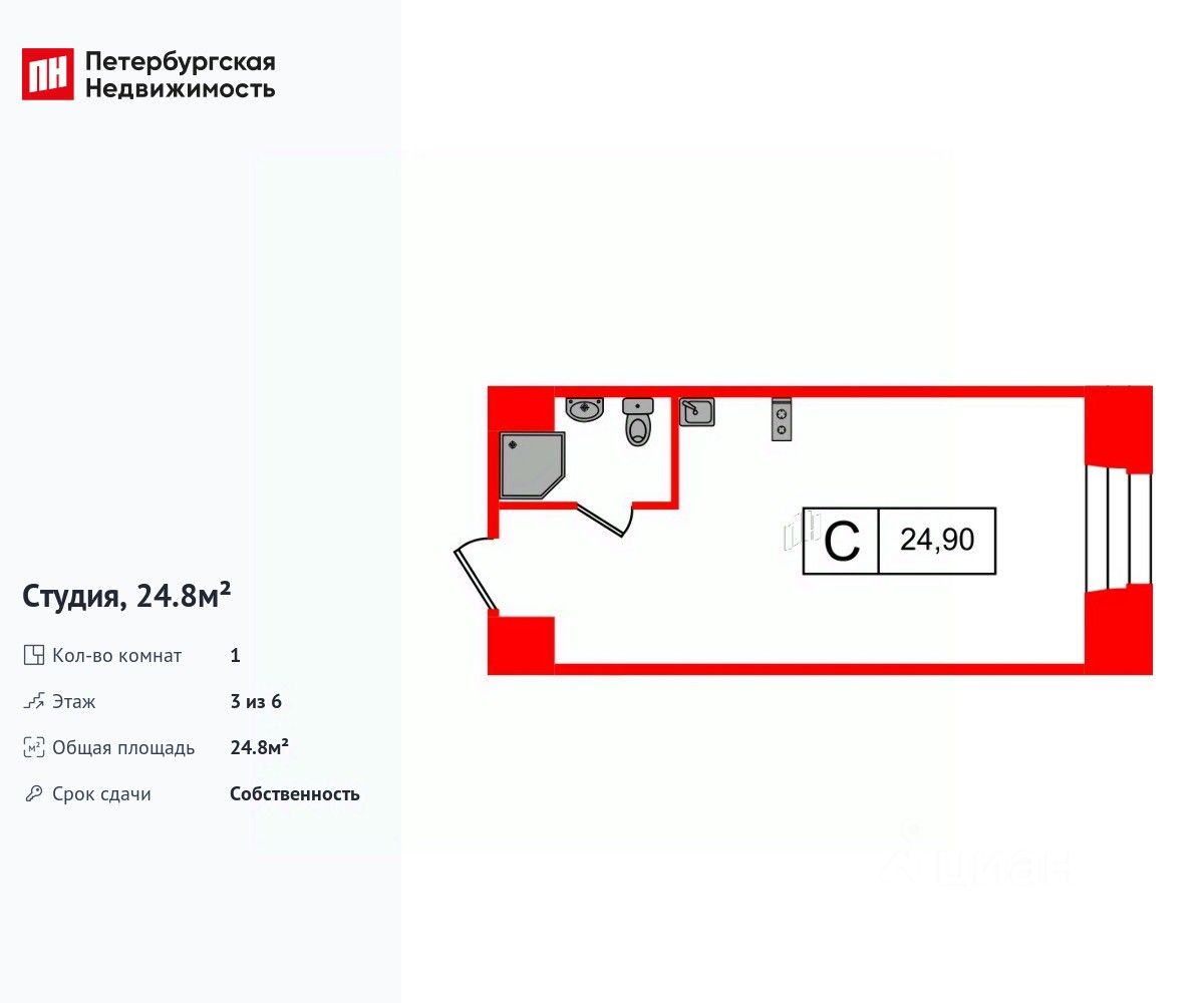 Удобная, классическая, функциональная европланировка. Общая площадь апартаментов - 24.8 м², высота потолка 3 м.