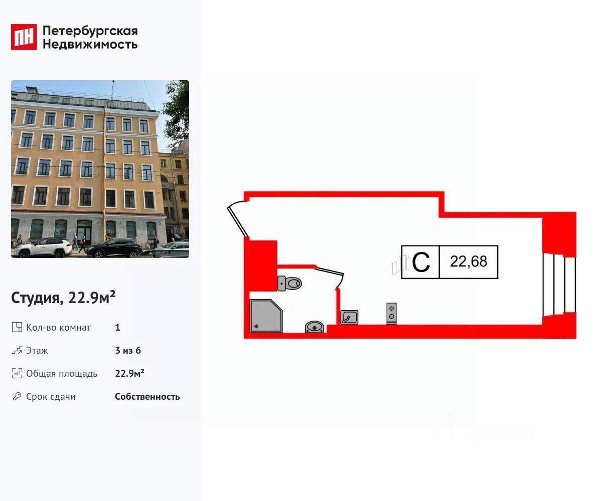 Удобная, классическая, функциональная европланировка. Общая площадь апартаментов - 22.9 м², высота потолка 3 м.