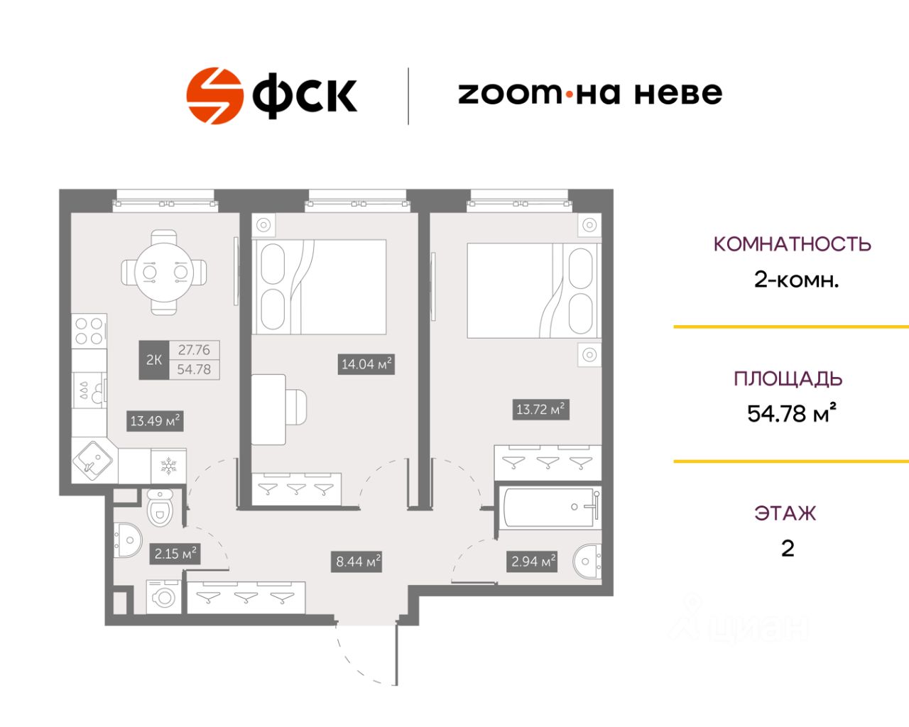 Цена со скидкой до 30% в прямой продаже от застройщика — только в этом месяце. При покупке апартаментов - паркинг за полцены. На все апартаменты действует беспроцентная рассрочка. Купите на распродаже! Покупка недвижимости в Zoom на Неве сейчас со скидкой до 30% позволит через 2 года получить доход до 6 300 000 руб. Роскошные виды на Неву. 2-к апартамент в комплексе класса бизнес-лайт Zoom на Неве на 2-м этаже. Общая площадь 54,78. Без отделки.