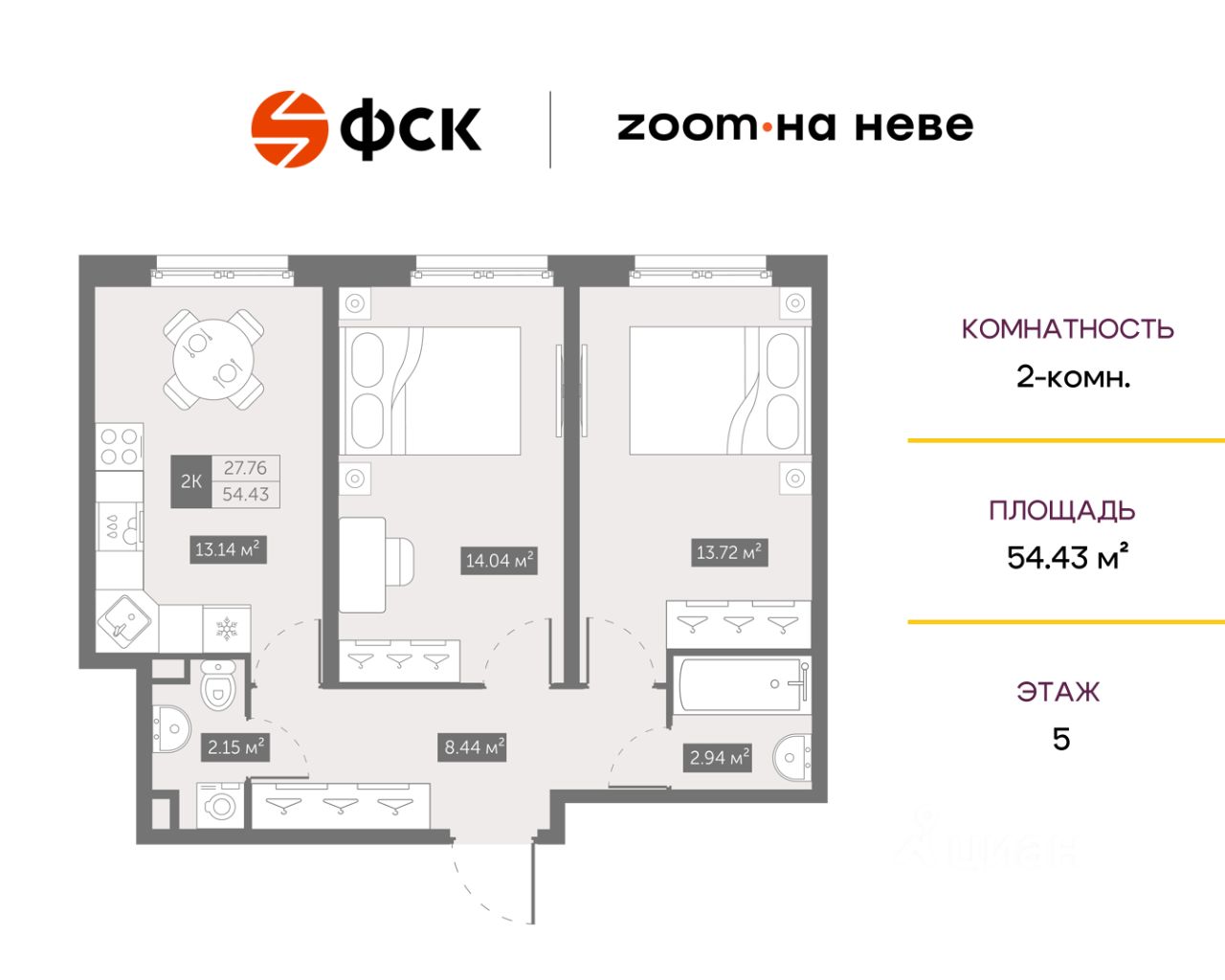 Цена со скидкой до 30% в прямой продаже от застройщика — только в этом месяце. При покупке апартаментов - паркинг за полцены. На все апартаменты действует беспроцентная рассрочка. Купите на распродаже! Покупка недвижимости в Zoom на Неве сейчас со скидкой до 30% позволит через 2 года получить доход до 6 300 000 руб. Роскошные виды на Неву. 2-к апартамент в комплексе класса бизнес-лайт Zoom на Неве на 5-м этаже. Общая площадь 54,43. Без отделки.