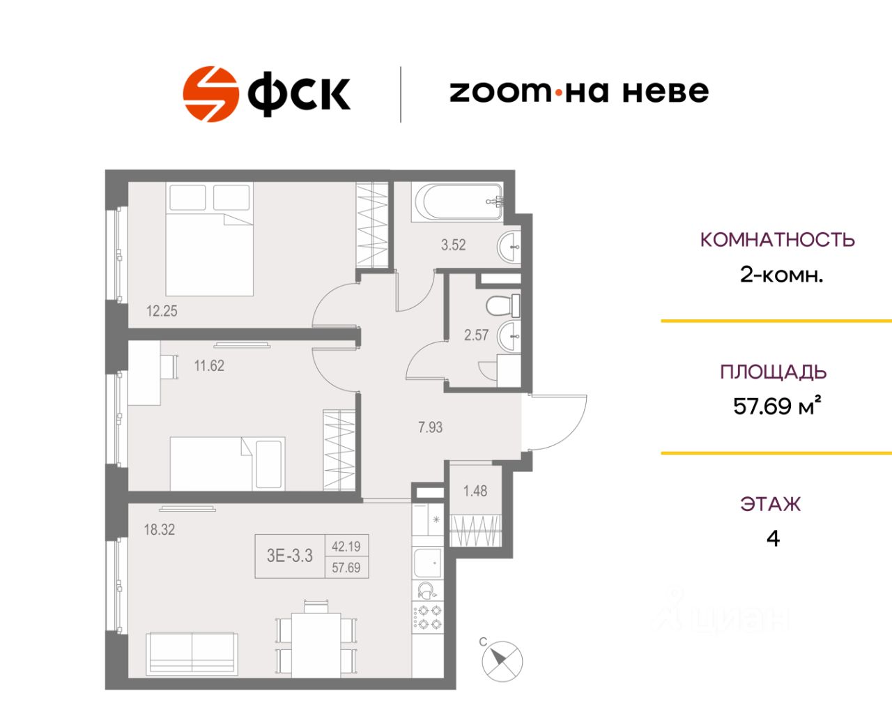 Цена со скидкой до 30% в прямой продаже от застройщика — только в этом месяце. При покупке апартаментов - паркинг за полцены. На все апартаменты действует беспроцентная рассрочка. Купите на распродаже! Покупка недвижимости в Zoom на Неве сейчас со скидкой до 30% позволит через 2 года получить доход до 6 300 000 руб. Роскошные виды на Неву. 2-к апартамент в комплексе класса бизнес-лайт Zoom на Неве на 4-м этаже. Общая площадь 57,69. Без отделки.