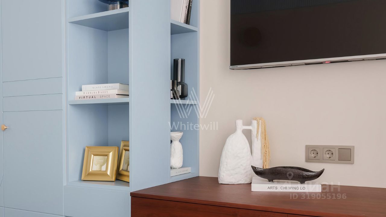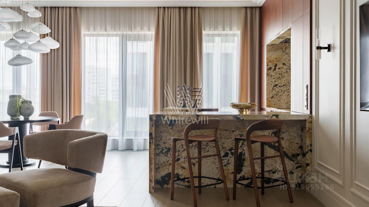 Интерьеры укомплектованы мебелью и техникой. Планировкой предусмотрены кухня-гостиная, мастер-спальня с собственной ванной и гардеробной, две спальни, ванная комната, гардеробная, постирочная, прихожая. Двенадцать панорамных окон наполняют пространство естественным светом и теплом, открывая виды на две стороны — на благоустроенную территорию комплекса и улицу Усачева.
