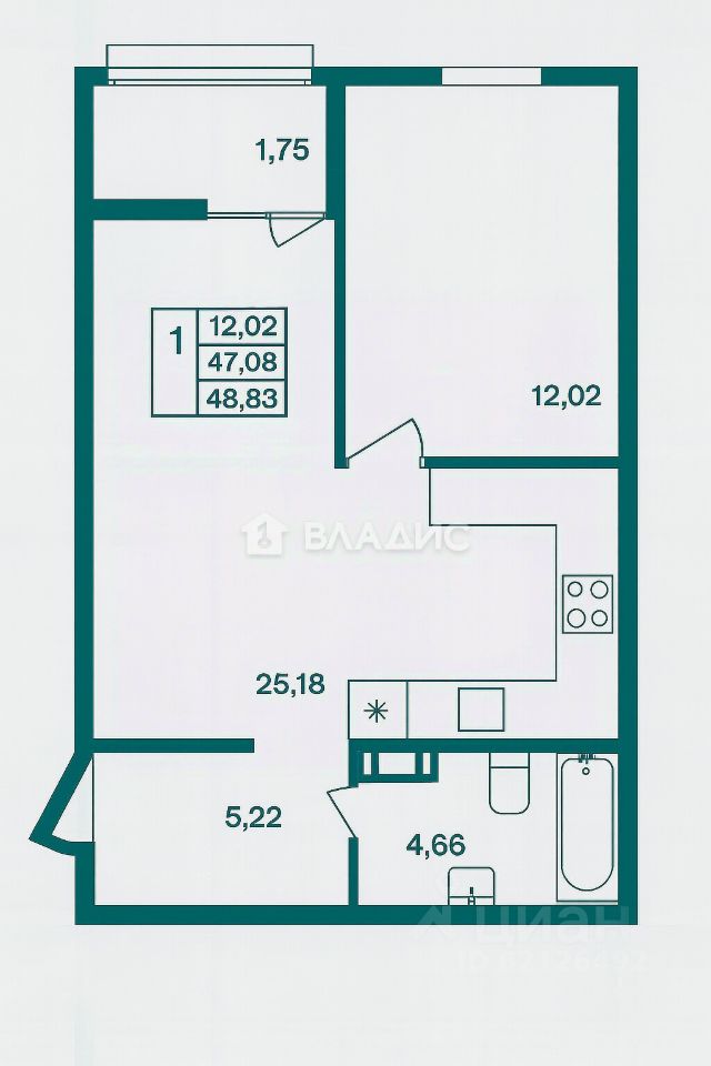 Адрес: г. Всеволожск, мкр. Южный, ул. Крымская, д. 3 4 этаж из 9, панельный дом с центральным отоплением Общая площадь — целых 47,9 м² Жилая комната — 12 м² Огромная кухня-гостиная — 25 м² Совмещённый санузел, лоджия, окна во двор