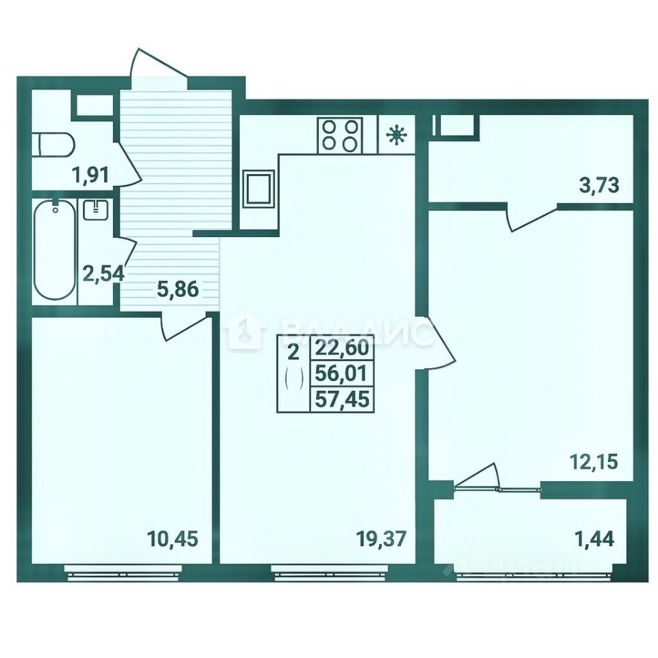 Планировка: — Изолированные комнаты: 10,45 м² и 15,88 м² — Просторная кухня-гостиная: 19,37 м² — Раздельный санузел — Застеклённая лоджия (стеклопакеты в пол — уже установлены) — Отдельная гардеробная
