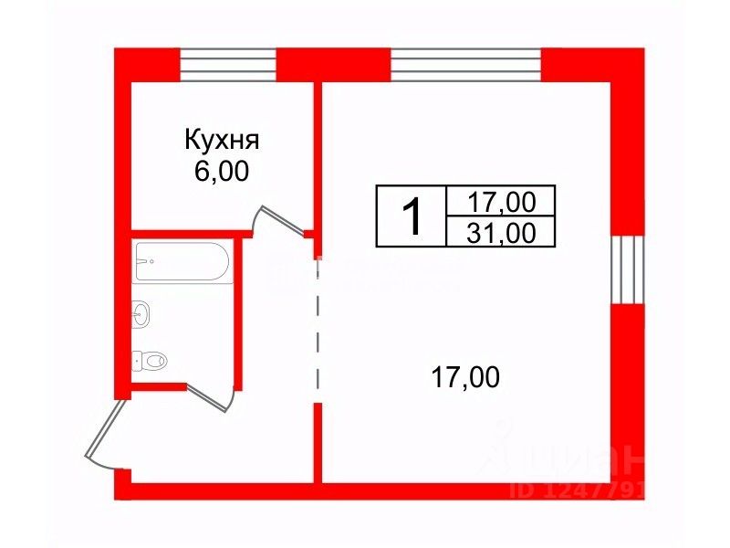 Комната 17 кв.м, кухня 6 кв.м. Общая площадь - 31 кв.м