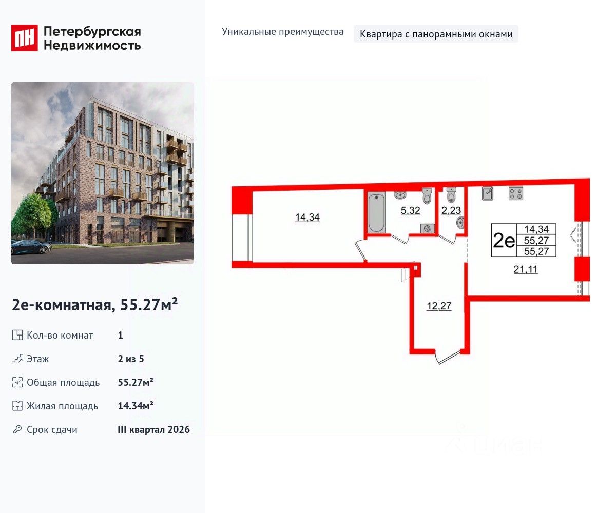 Уникальная, функциональная европланировка, большая кухня-гостиная 21.11 м², просторная прихожая 12.27 м². Общая площадь квартиры - 55.27 м², жилая 14.34 м², высота потолка 3 м.
