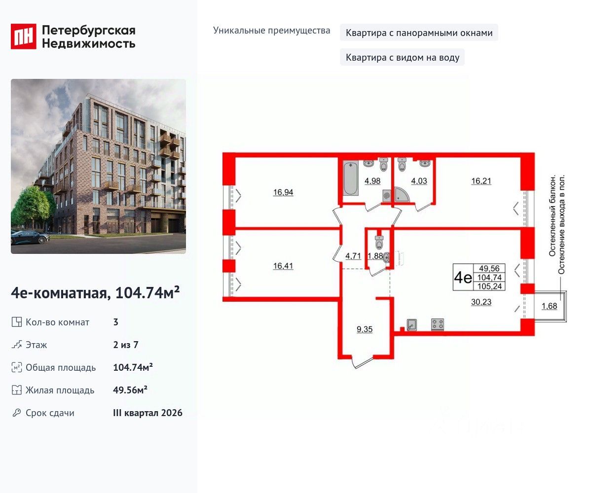 Уникальная, функциональная европланировка, большая кухня-гостиная 30.23 м², вместительная прихожая 9.35 м². Общая площадь квартиры - 104.74 м², жилая 49.56 м², высота потолка 3 м.