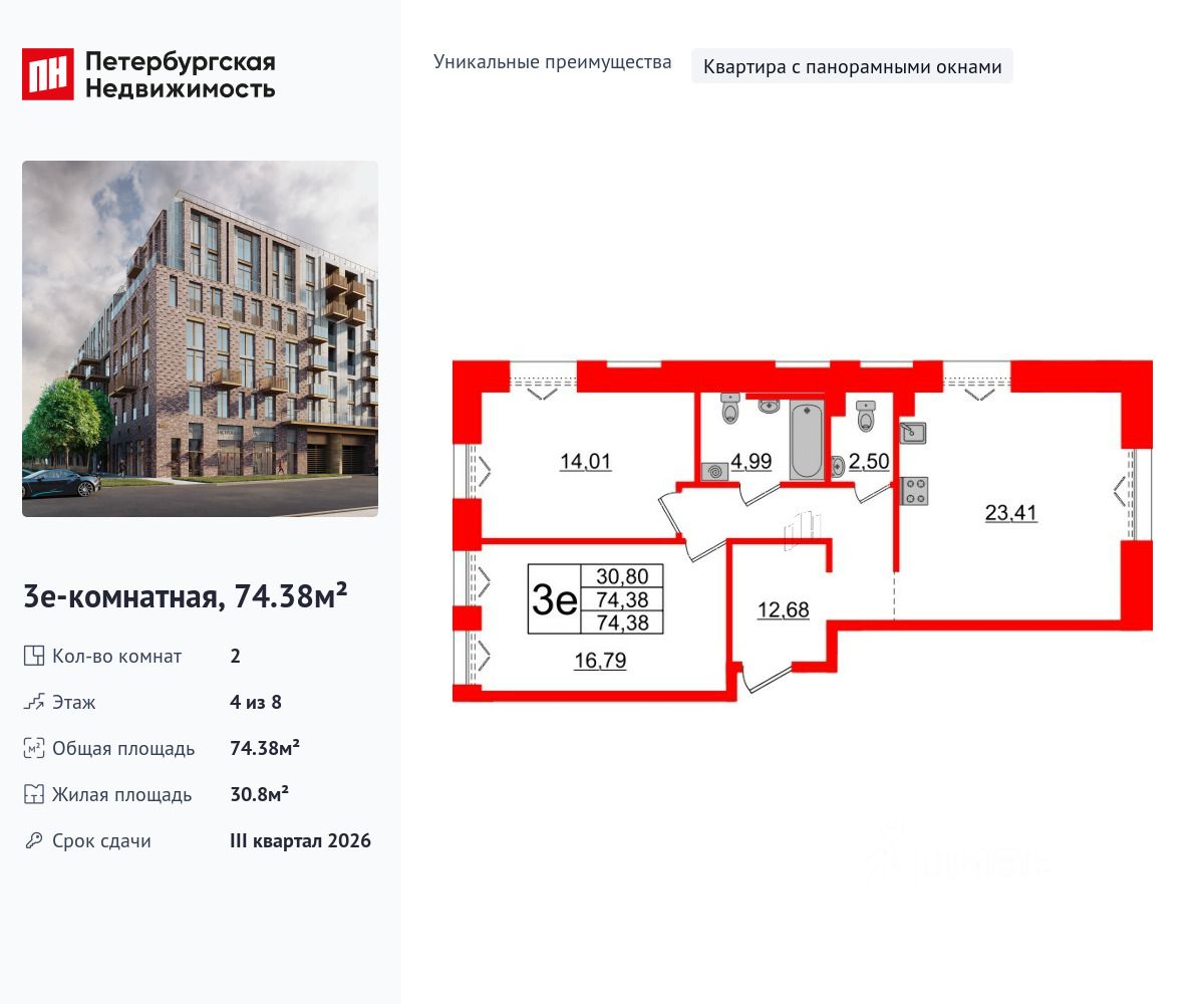 Уникальная, функциональная европланировка, большая кухня-гостиная 23.41 м², просторная прихожая 12.68 м². Общая площадь квартиры - 74.38 м², жилая 30.8 м², высота потолка 3 м.