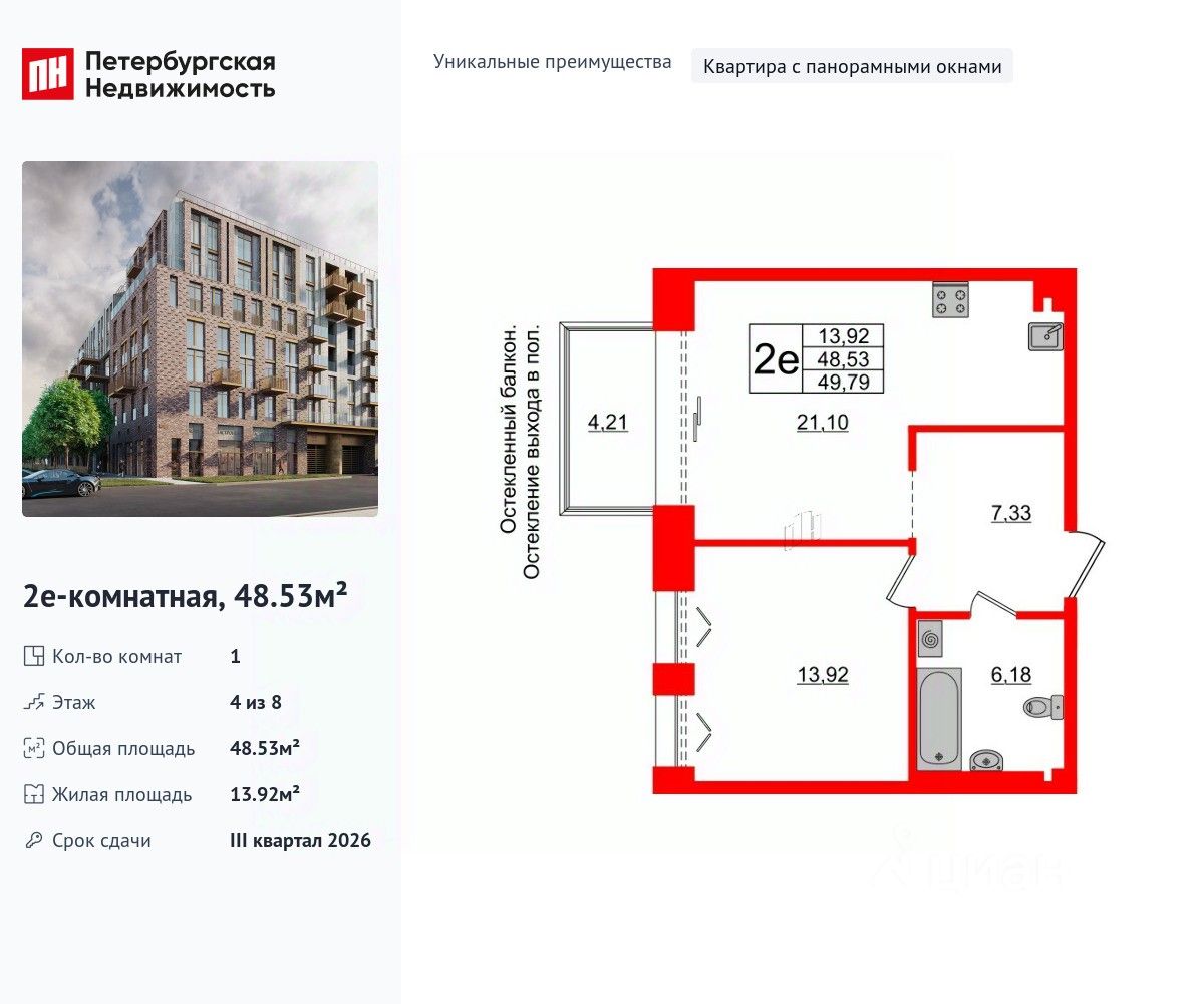 Уникальная, функциональная европланировка, большая кухня-гостиная 21.1 м², просторная прихожая 7.33 м². Общая площадь квартиры - 48.53 м², жилая 13.92 м², высота потолка 3 м.
