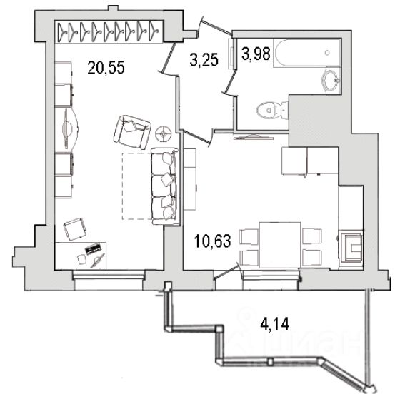 Большой санузел -4,0 м2, ванна, балкон.