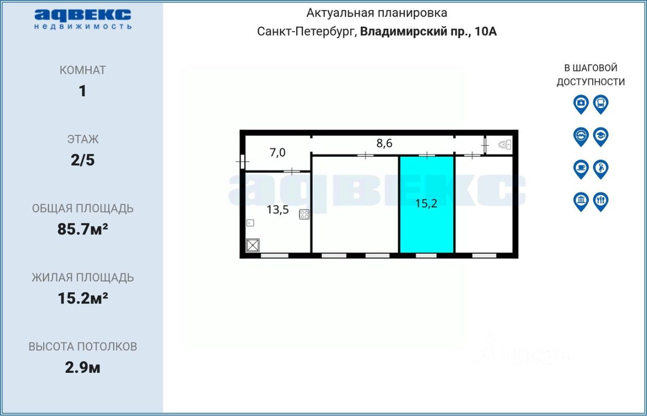 В прямой продаже комната правильной формы, в 4 минутах пешком от метро Владимирская. Замечательная локация, вблизи нескольких станций метро, достопримечательности города, рестораны, музеи и театры!