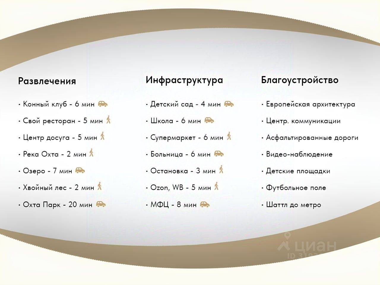 Посёлок с городским комфортом: - Шаттл до м. Парнас, остановки рядом, школьный автобус - Круглосуточная охрана и видеонаблюдение - Детские площадки, скейт-парк, футбольное поле, зоны отдыха - БЕЗОПАСНОСТЬ: КПП с круглосуточной охраной и видеонаблюдением - Инфраструктура рядом: магазины, кафе, школы, детсады, поликлиника, аптеки - Природа рядом: леса, озера, конноспортивный клуб, горнолыжные курорты