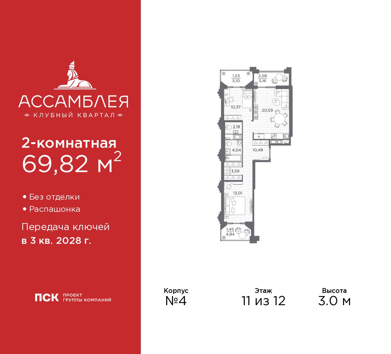 Продается 2-комн. квартира в Клубный квартал ''Ассамблея'' на 11 этаже. Квартира без отделки, после оформления собственности можно делать ремонт. Общая площадь: 69.82 кв.м., жилая: 23.38 кв.м., площадь просторной кухни-столовой: 20.59 кв.м. Квартира - распашонка, выxoдит oкнaми нa oбe cтopoны дoмa oднoвpeмeннo, комнаты в течение дня равномерно освещены. В квартире три балкона, один совмещенный и один раздельный санузел. Высота потолков 3.0 м.