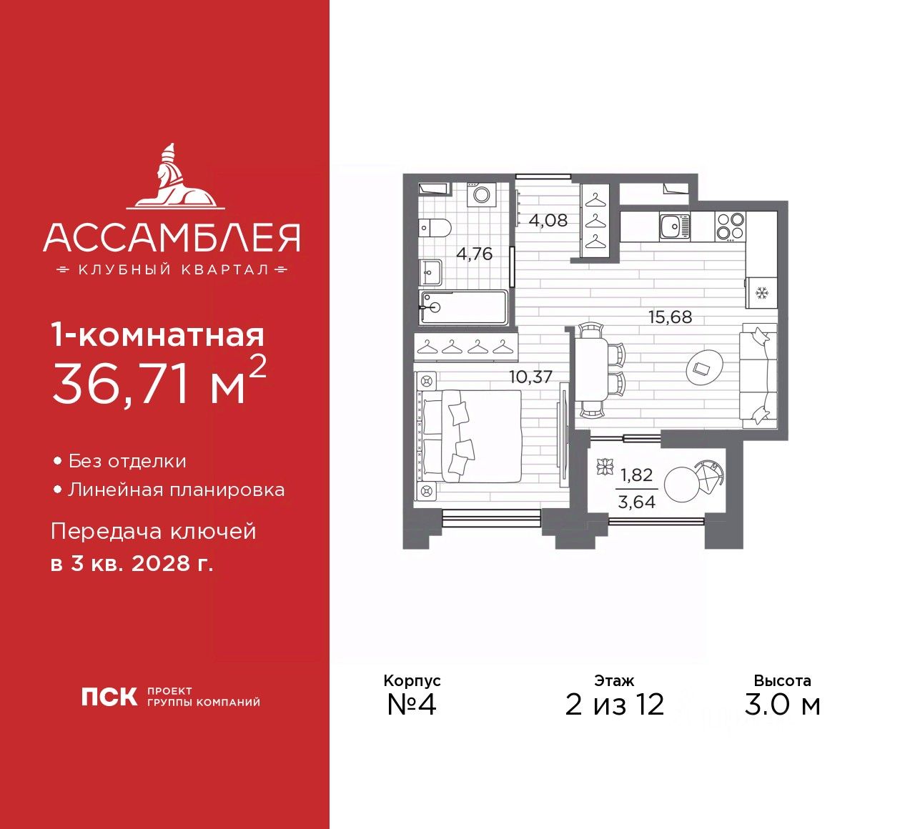 Продается однокомнатная квартира в Клубный квартал ''Ассамблея'' на 2 этаже. Квартира без отделки, полностью готова к ремонту. Общая площадь: 36.71 кв.м., жилая: 10.37 кв.м., площадь просторной кухни-столовой: 15.68 кв.м. Все окна выходят на одну сторону. В квартире одна лоджия, один совмещенный санузел. Высота потолков 3.0 м.