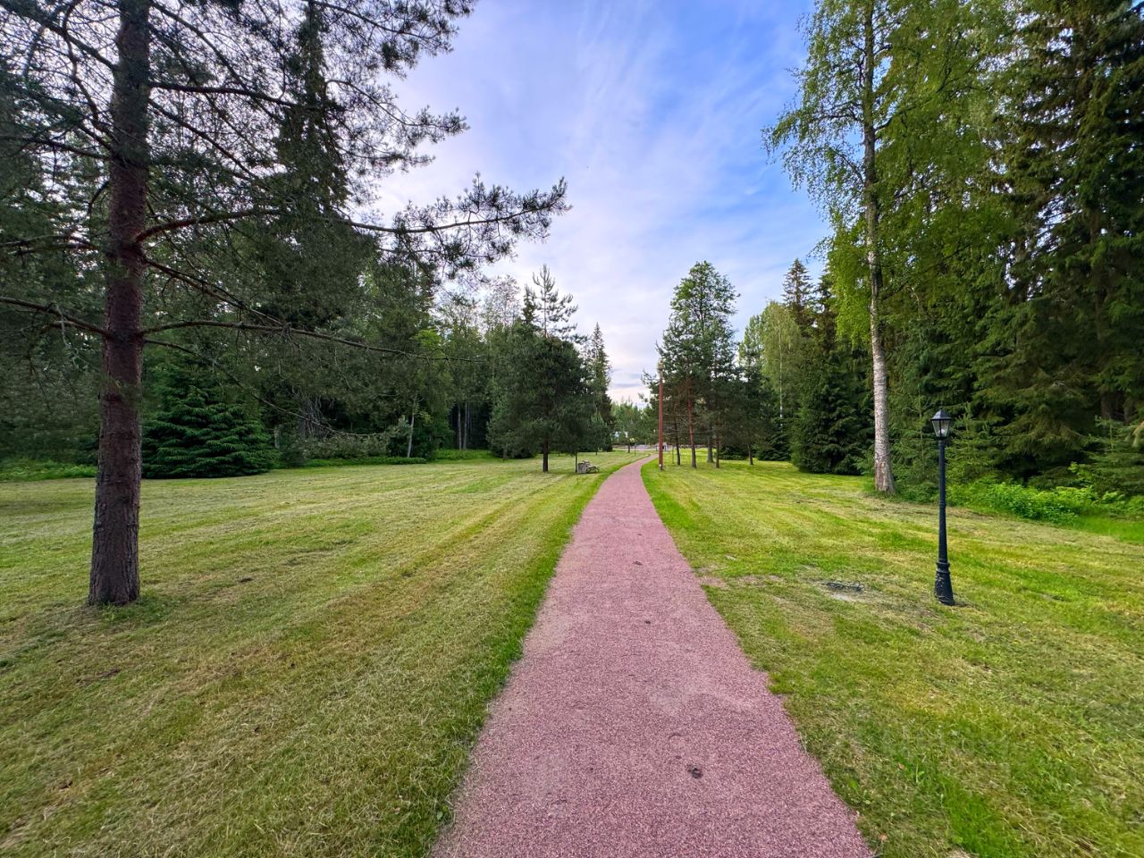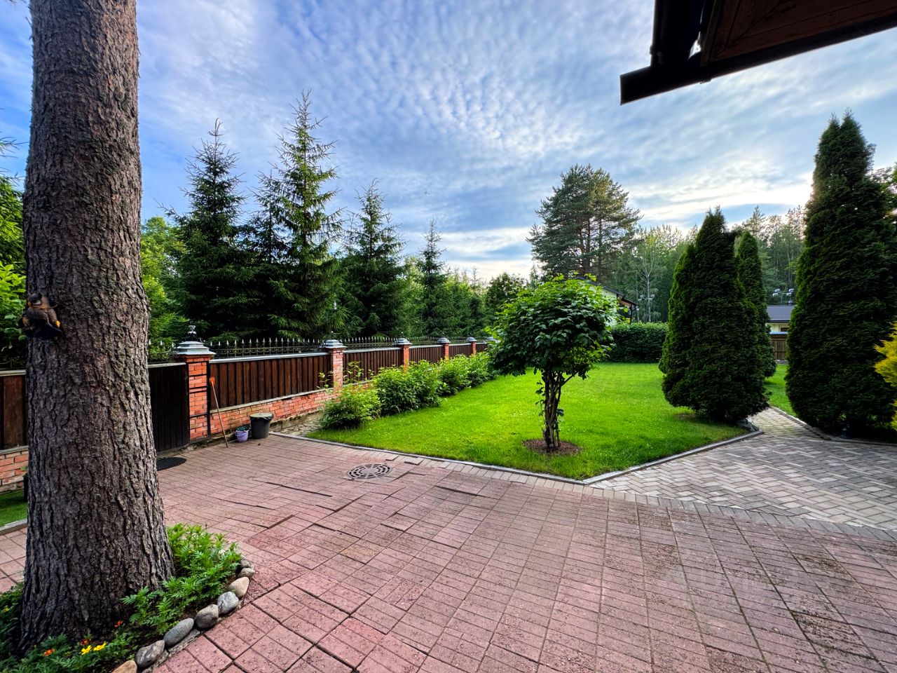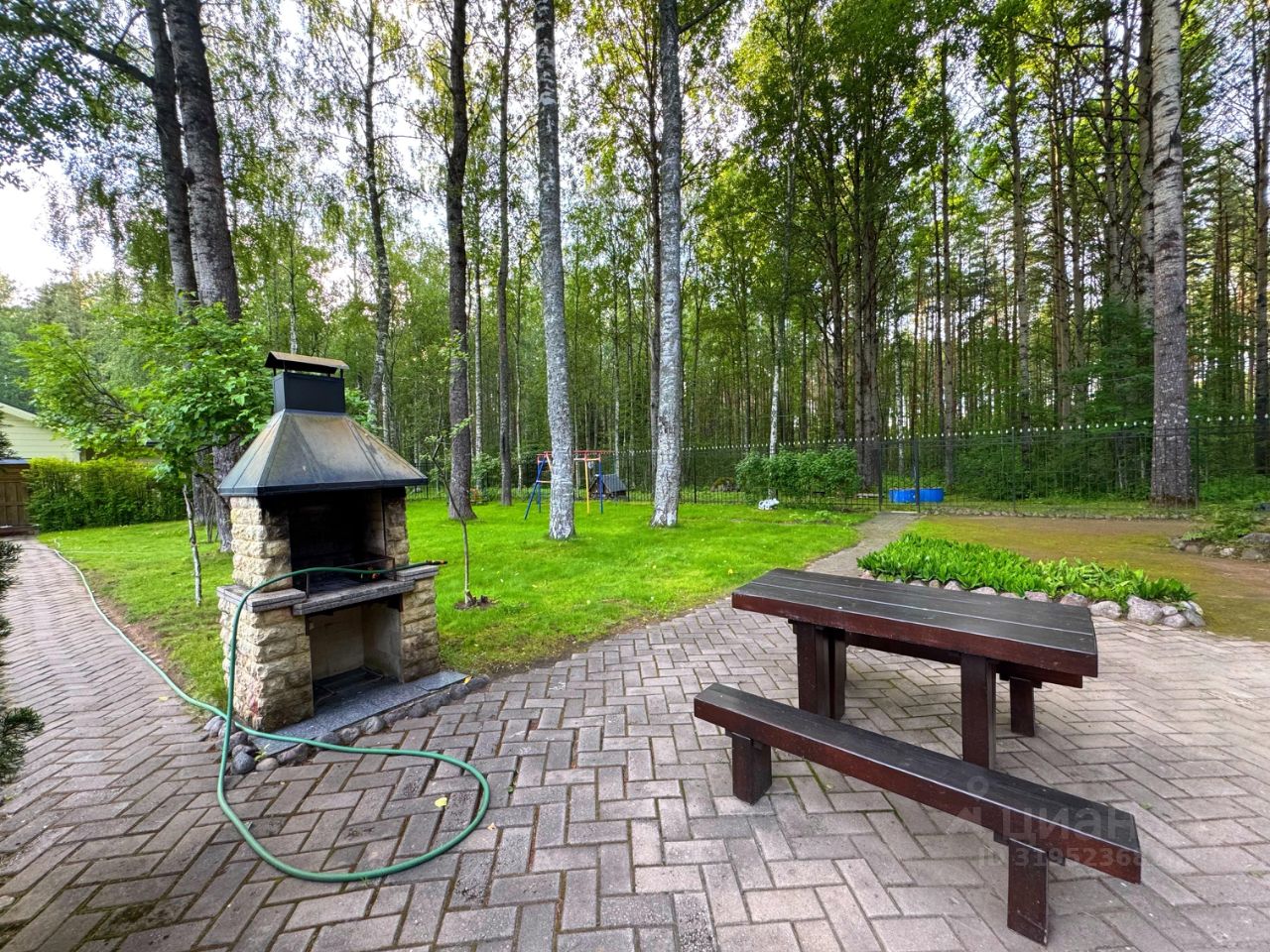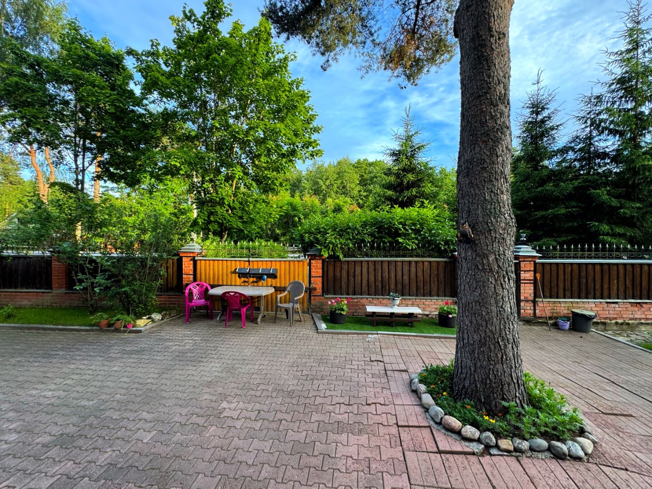 Территория участка просторная, облагороженная и огороженная, вокругвековые деревья, отдельный выход в лес, зона барбекю, детская площадка, теплица.