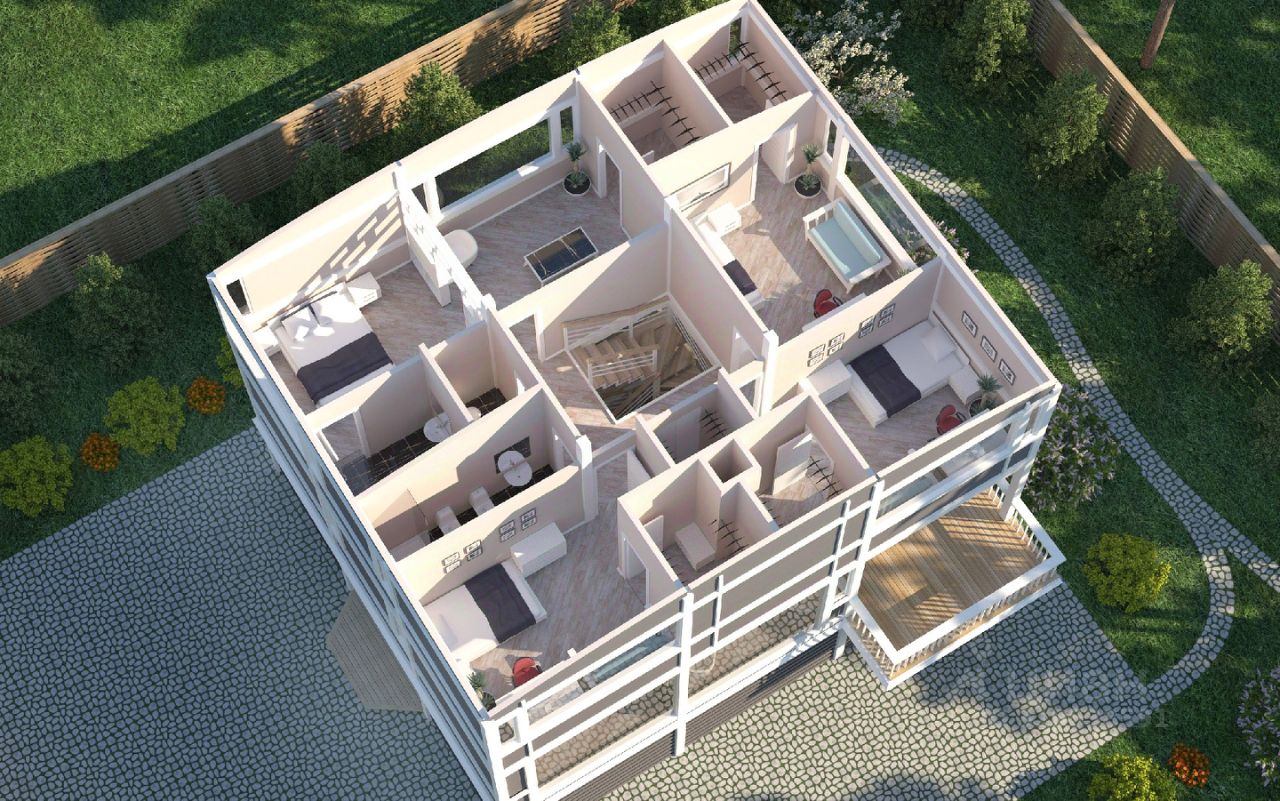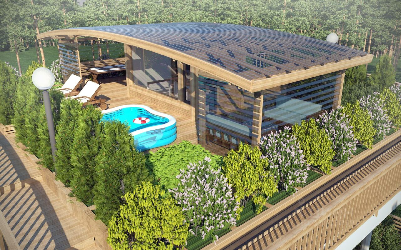 На этом же этапе также выполняется обустройство парка на крыше, включая инженерные сети: освещение, водоснабжение, автополив, дренаж. Третий этап строительства - сама чистовая отделка или отделка ''под ключ''. Она обычно выполняется индивидуально под конкретного заказчика с учетом его вкусов и предпочтений. Это включает чистовую отделку стен, их покраску, укладку керамической плитки в ванных и кварцвиниловой плитки в остальных помещениях, монтаж чистовых потолков, чистовой электрики и сантехники, установку межкомнатных дверей и кухонной мебели, чистовую отделку террасы, крыши, посадку растений. Оплата производится поэтапно по мере строительства. При желании дом можно построить и своими силами, пригласив своего застройщика. Для этого достаточно согласовать проект в Правлении и выдержать единый архитектурный стиль посёлка. Возможно также заказать у застройщика посёлка первые этапы строительства дома, а остальные работы выполнить самостоятельно по своему усмотрению.