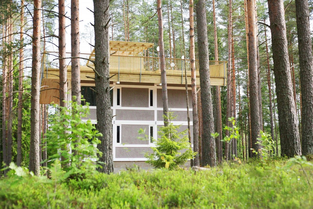 Участок расположен на возвышенности в окружении сосен, с крыши дома открывается прекрасный вид на кроны окружающих его деревьев.
