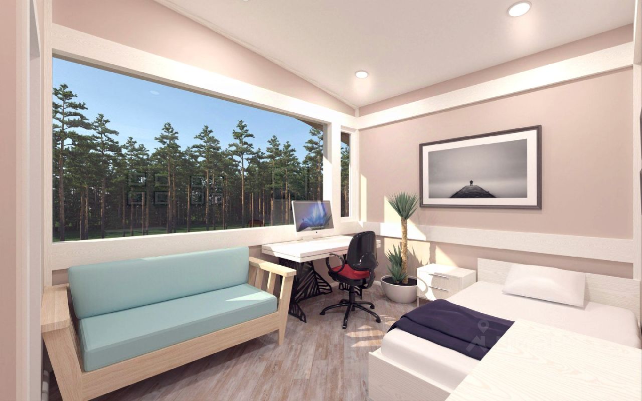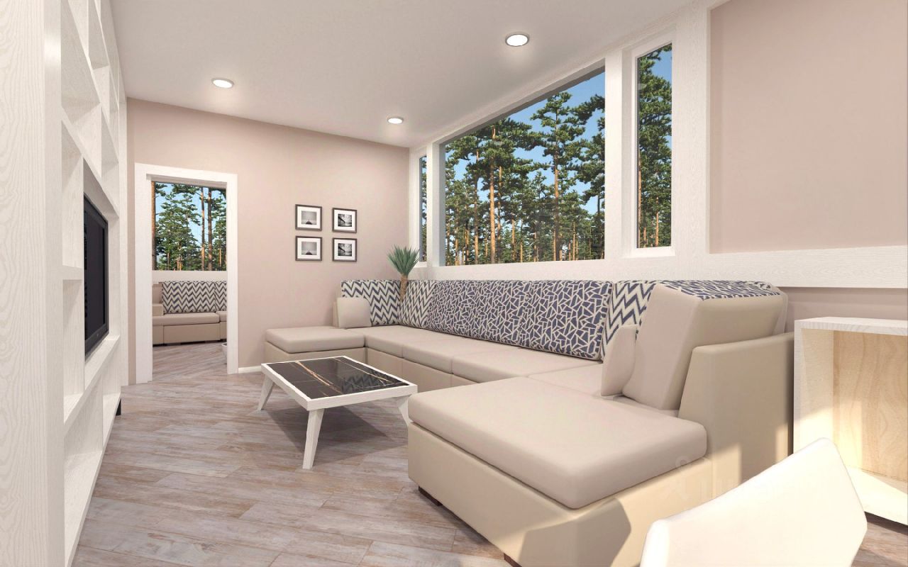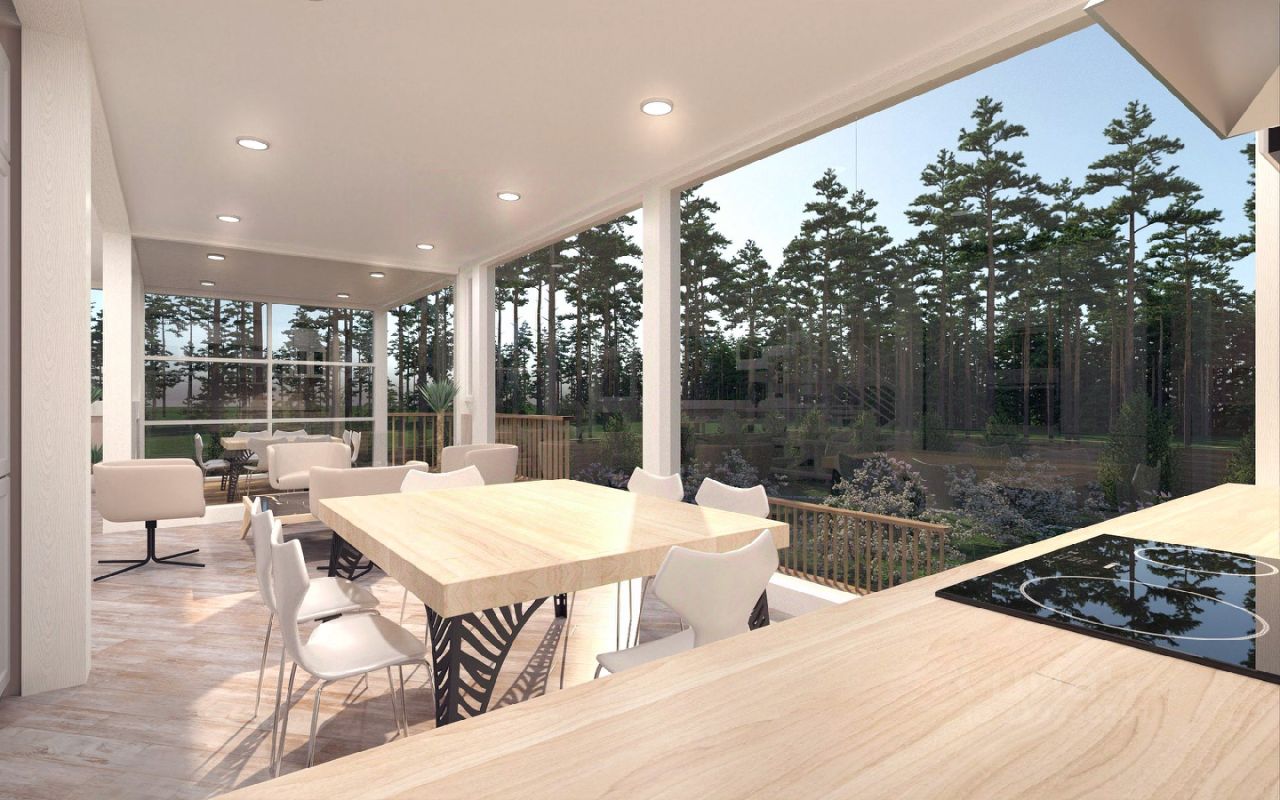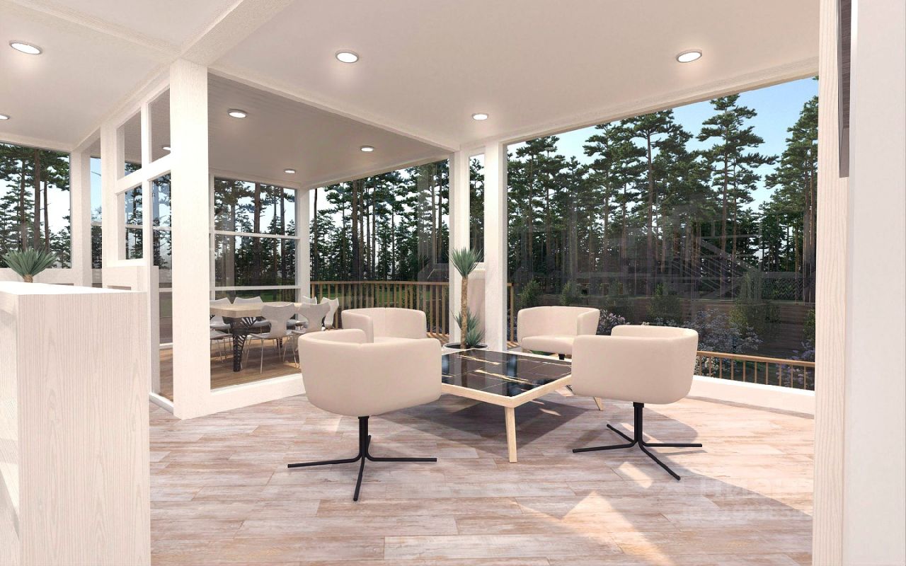 Первый этап строительства дома - ''теплый контур'' включает в себя возведение фундамента (забивные бетонные сваи), строительство самого дома, его отделка снаружи, панорамное остекление, черновые полы перекрытий, крыша, утепление дома по всему внешнему периметру. Второй этап строительства (готовность под чистовую отделку) включает все внутренние работы и материалы по возведению перегородок, укладке бетонных стяжек полов, монтажу всех инженерных систем и сетей: электрики, водоснабжения, вентиляции, отопления, канализации, установки черновой электрики и сантехники.