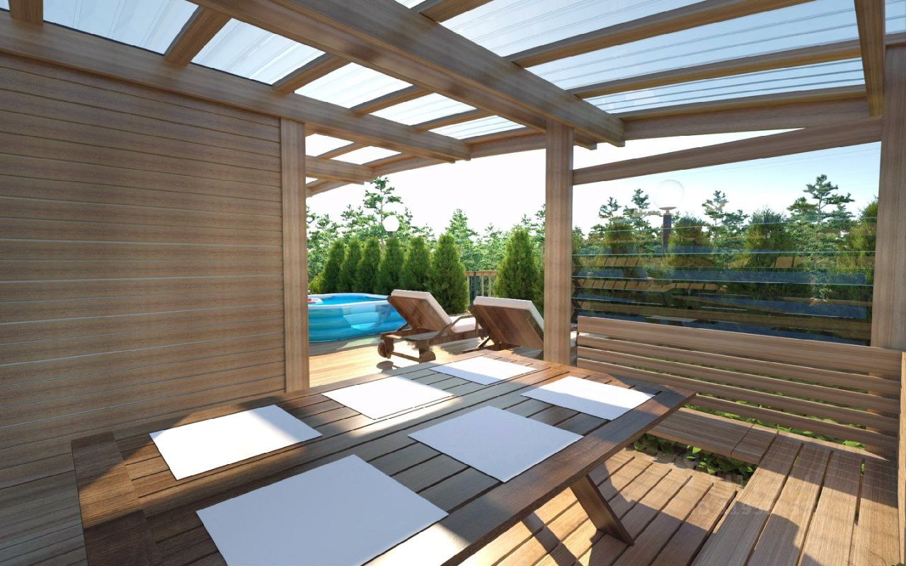 Для данного участка спроектирован дом из серии Hillpark - Проект М (двухэтажный дом с цоколем, эксплуатируемой кровлей, балконом и террасой). Проект М имеет площадь внутренних отапливаемых помещений 287 м2, а вместе с большой открытой террасой и эксплуатируемой кровлей составляет 492 м2. В цокольном этаже дома располагается большая прихожая с гардеробом, котельная/прачечная, комната отдыха (или спортзал), ванная комната, сауна, а также двухкомнатная гостевая со спальней и своим кабинетом/гостиной. Большую часть 1 этажа занимает кухня-гостиная с панорамными окнами на три стороны света, с выходом на крытый балкон и открытую террасу. Здесь также находятся кабинет, гостевой санузел и хозяйственная кладовая/прачечная с входом прямо из кухни. На 2 этаже расположена большая мастер-спальня с видом на две стороны света с вместительной гардеробной и своей ванной комнатой, а также три детские спальни, каждая со своим личным гардеробом. Для этих спален предусмотрены общая ванная комната и дополнительный санузел, а в холле поместилась ещё небольшая хозкладовая. Прямо из холла второго этажа можно подняться по лестнице на эксплуатируемую кровлю. Здесь в окружении плодовых и декоративных растений на просторной открытой террасе могут располагаться кресла и шезлонги, детский бассейн, а под закрытым от дождя и ветра навесом летняя кухня с обеденным столом и местом для приготовления еды. Дом строится по технологии ''фахверк'' из клееного бруса. Для утепления используется теплоизоляционный материал PIR - огнестойкий материал, обладающий самой низкой теплопроводностью среди всех известных теплоизоляционных материалов. Панорамное остекление выполнено двухкамерными стеклопакетами толщиной 46 мм с теплоудерживающим покрытием. Въезд на участок расположен рядом с ответвлением дороги ведущей в центральный парк посёлка с его прудами и зонами отдыха. ЭТАПЫ СТРОИТЕЛЬСТВА