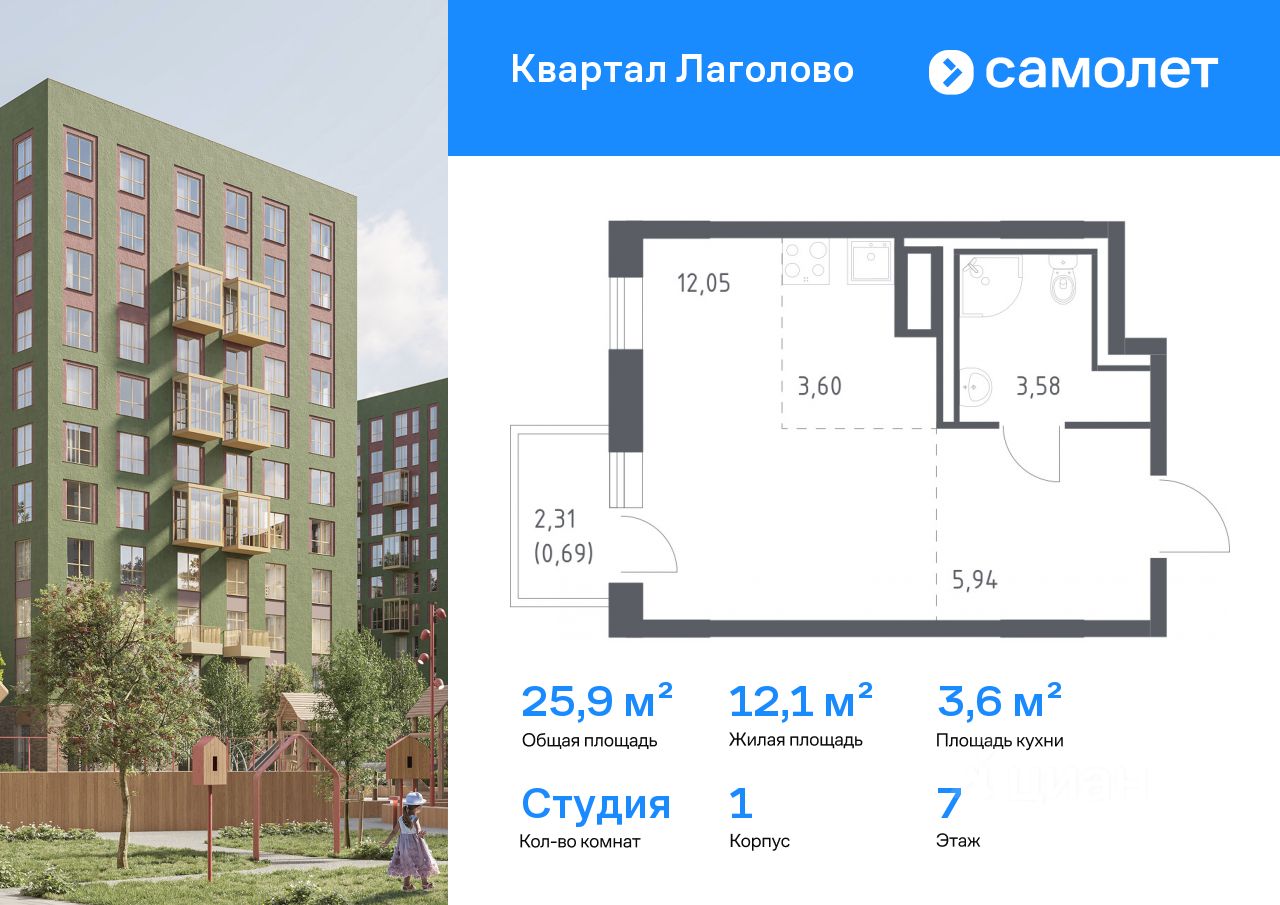 Строим кварталы для жизни с заботой о будущем. Предлагается квартира студия комфорт-класса 25,86 кв.м в корпусе 1 на 7 этаже, в ЖК ''Квартал Лаголово'' Квартира с предчистовой отделкой. Доступность дополнительных опций уточняйте у застройщика.