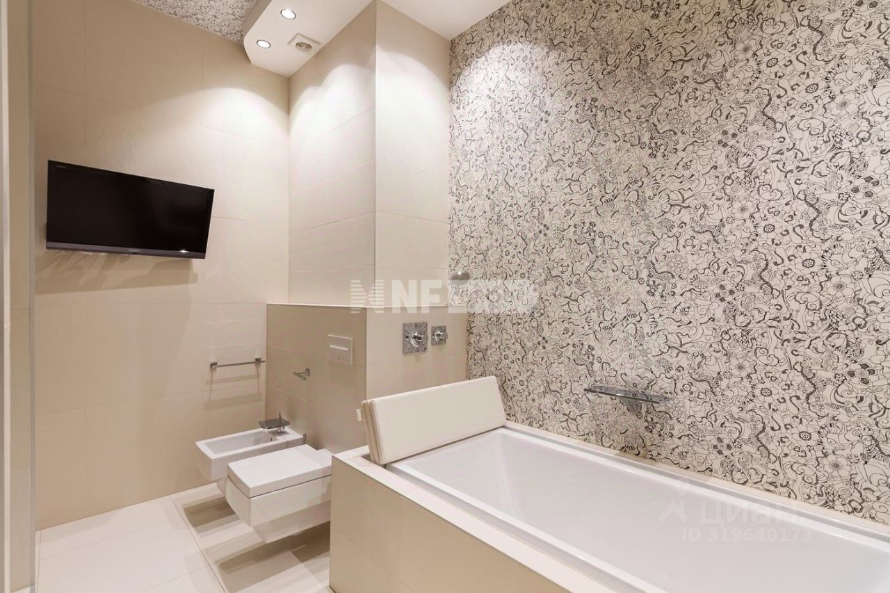 Планировка: гостиная 30 кв. м с зонированием пространства с помощью подиума, кухня итальянского производства с техникой Kuppersbusch, Gutmann и Jura, спальня с собственной гардеробной, оборудованной сейфом, ванная комната с сантехникой Duravit, ванной и душевой, гостевой санузел со стиральной машиной Miele и сушильной машиной Bosch.