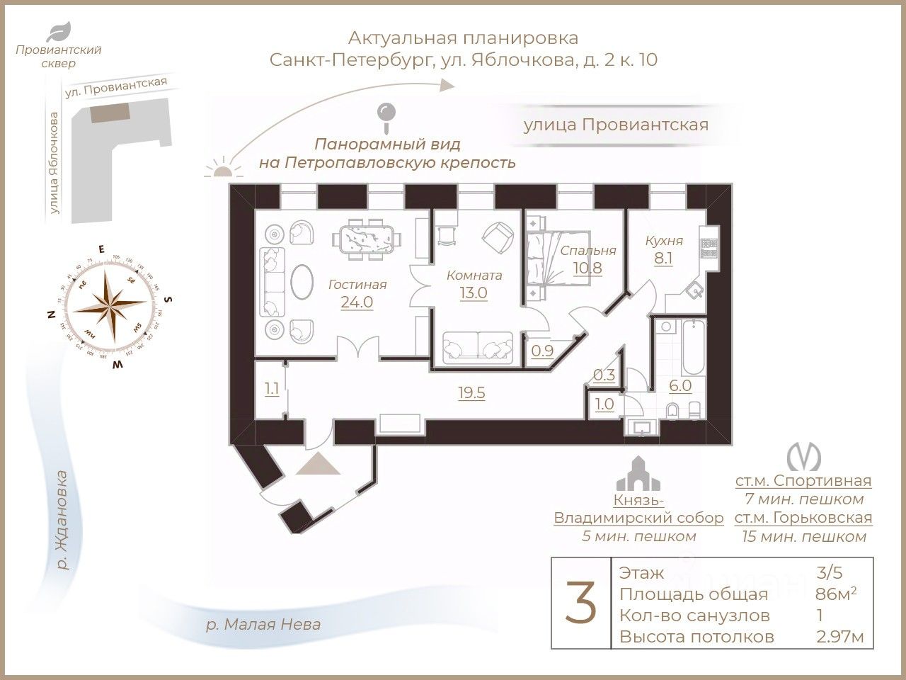 Просторная квартира в классическом стиле, общей площадью 86 метров, выходит окнами на тихую улицу (Провиантская). Перед домом расположена Мытнинская площадь с живописным Провиантским сквером, утопающем в зелени.