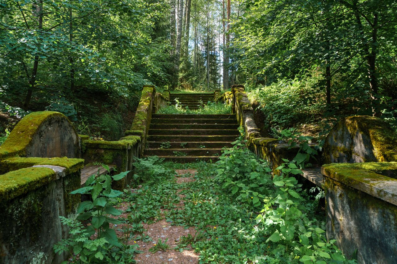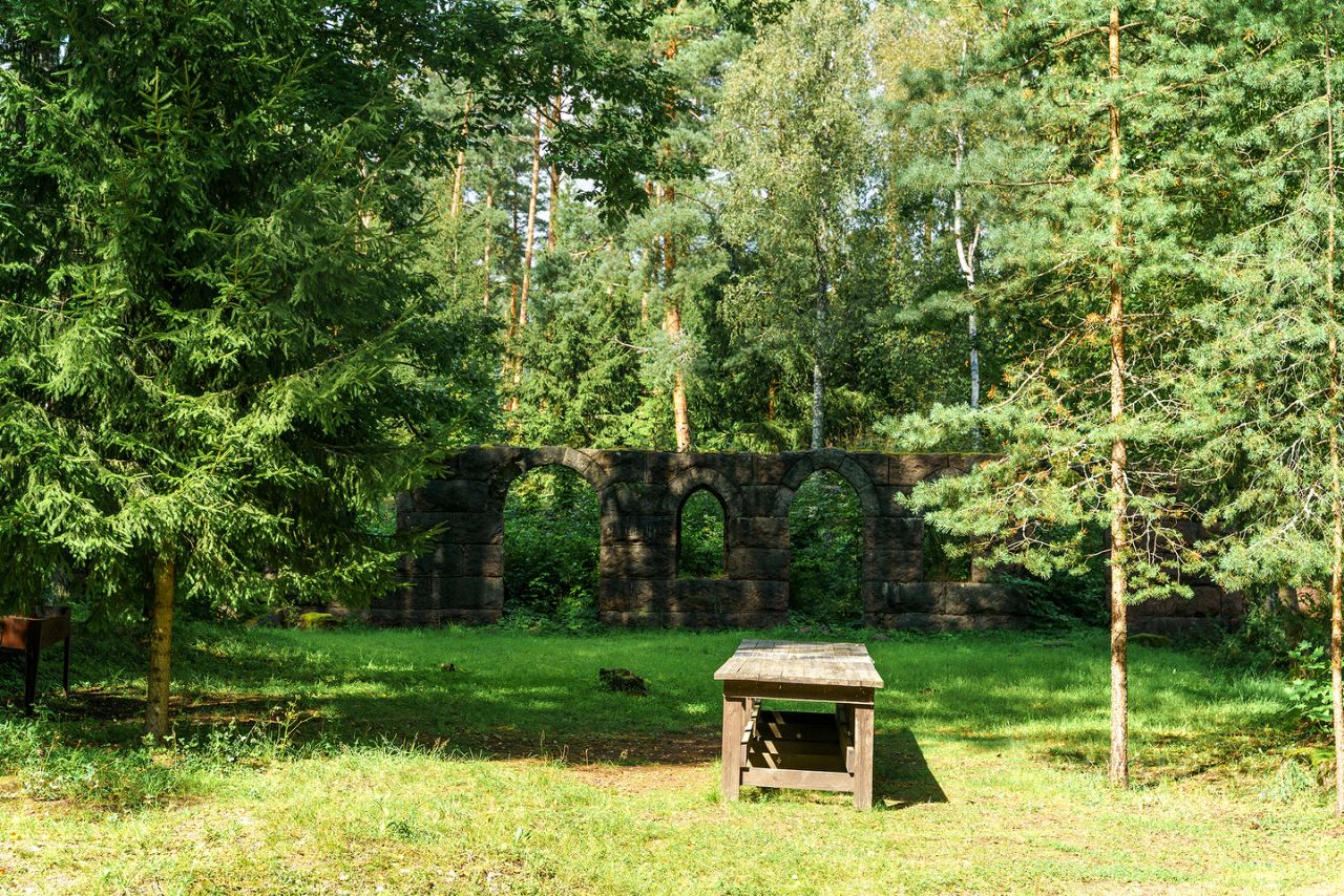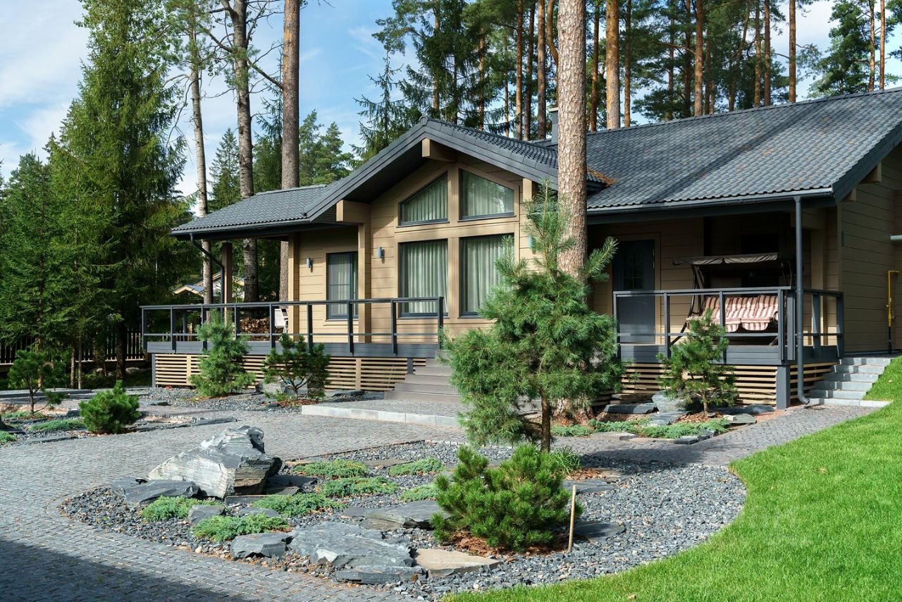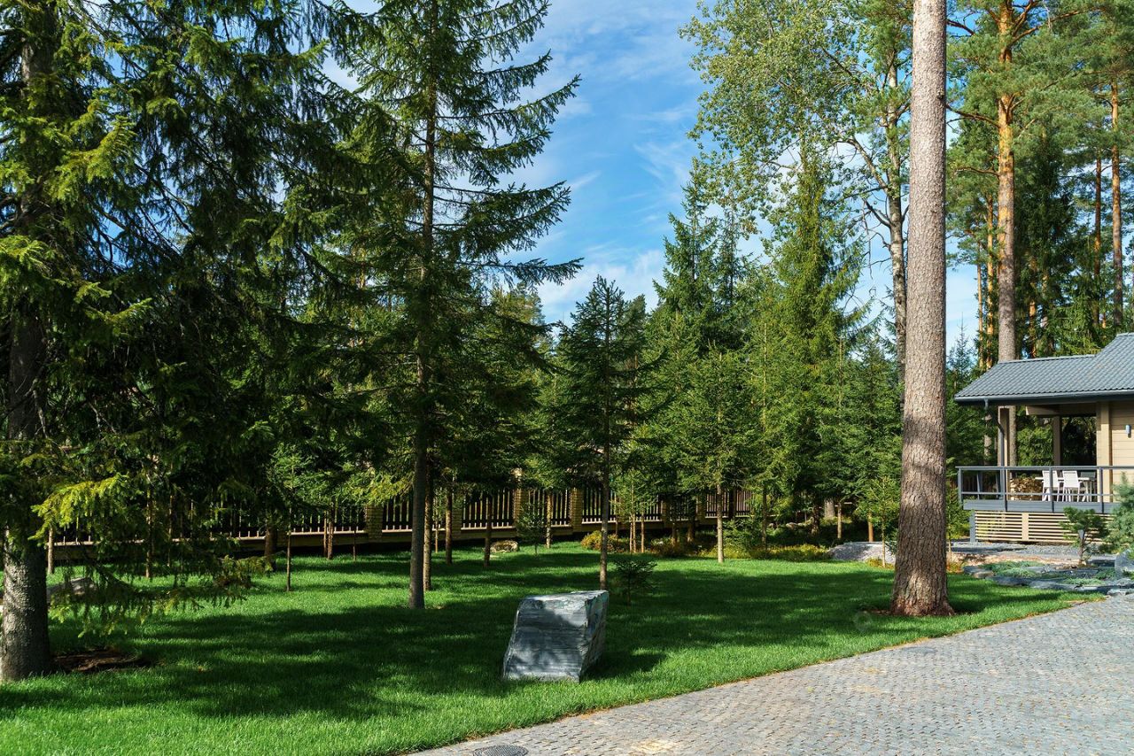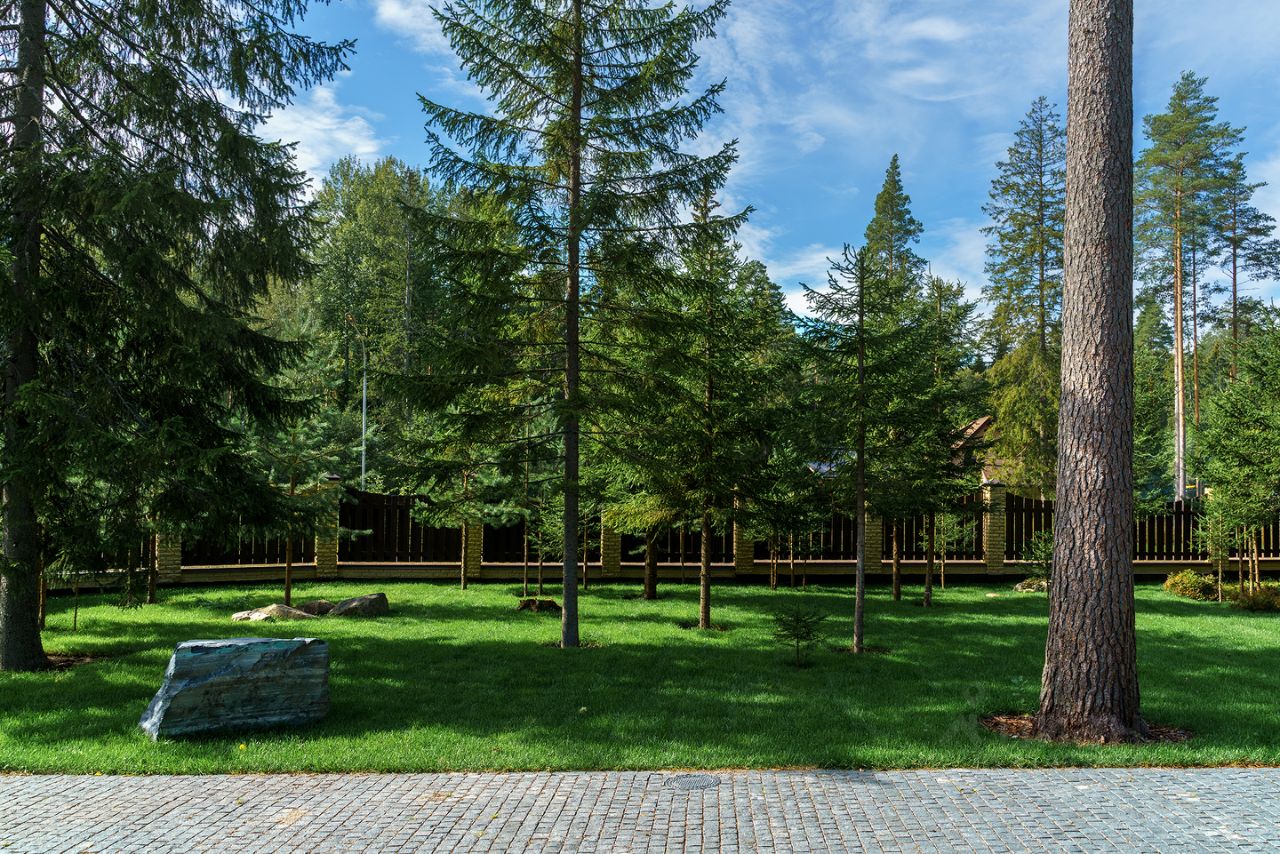Мощение участка из гранитной брусчатки (габбро-диабаз), при ландшафтном дизайне использованы глыбы шунгита. На участке сохранен естественный природный ландшафт, вековые сосны, черничник, грибы.