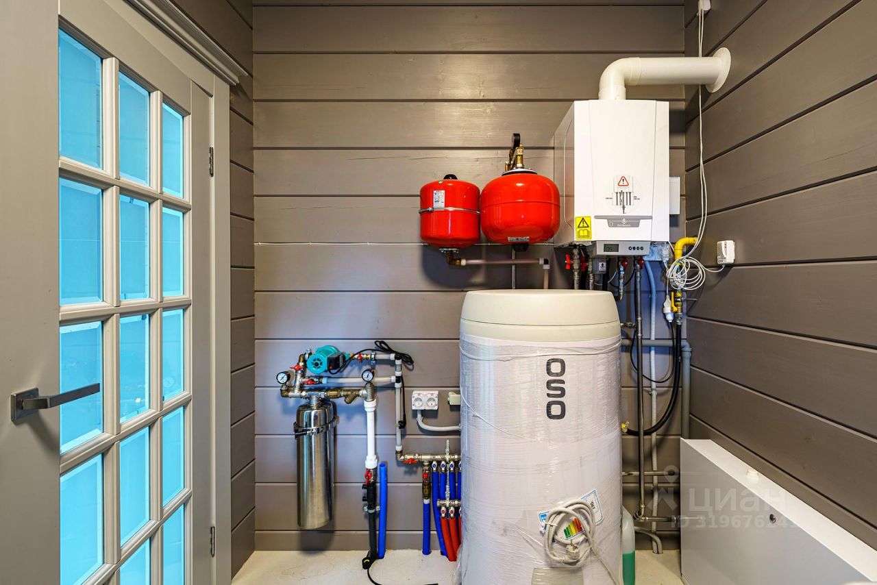 Установлен двухконтурный газовый котел DE Dietrich с управлением через интернет, бойлер OSO, отопление - магистральный газ, подогорев полов, немецкий камин Schmid, септик Астра 8.