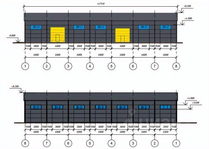 Первый склад площадью 756 м2 с двумя воротами: Здание имеет два входа через ворота шириной 4 м и высотой 4,2 метра, и два входа через двери шириной 0.9 м высотой 2.05 метра. Общие характеристики: - Длина по внутренним стенам - 42 м. - Ширина по внутренним стенам 18 м. - Высота внутренняя 6 м. - Строительный объем- 5 393 куб.м3.