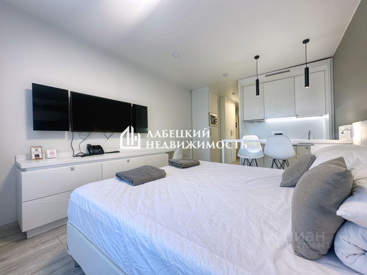 Кухонный гарнитур с варочной поверхностью, вытяжкой, посудомоечной машиной, микроволновой печью, чайником, всеми столовыми приборами, и всем необходимым. Встроенный холодильник с морозильной камерой, шкаф для хранения вещей. Комфортабельная двуспальная кровать, телевизор.