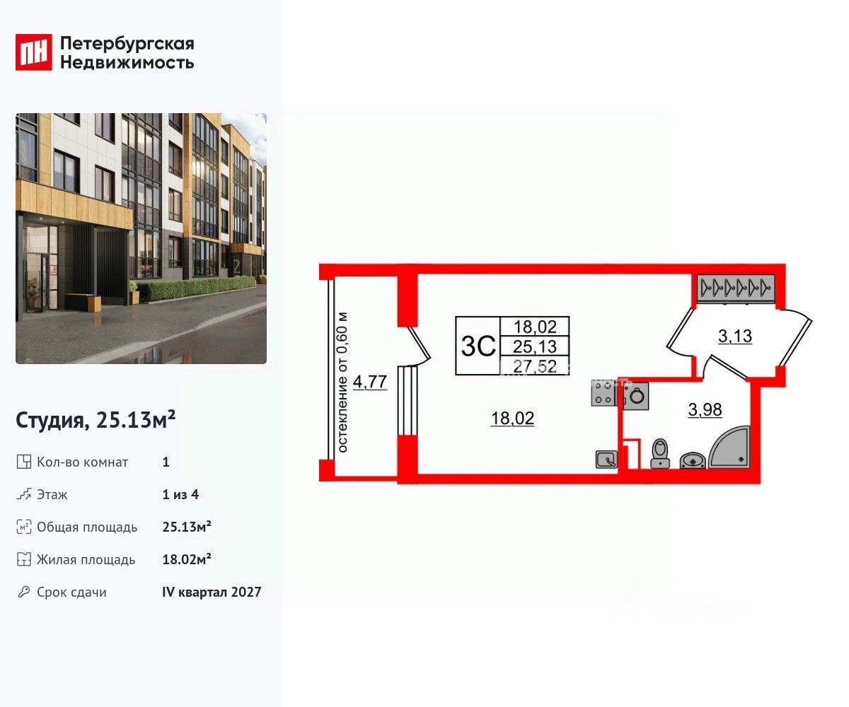 Удобная, классическая, функциональная европланировка, вместительная прихожая 3.13 м². Общая площадь студии - 25.13 м², жилая 18.02 м², высота потолка 2.77 м.