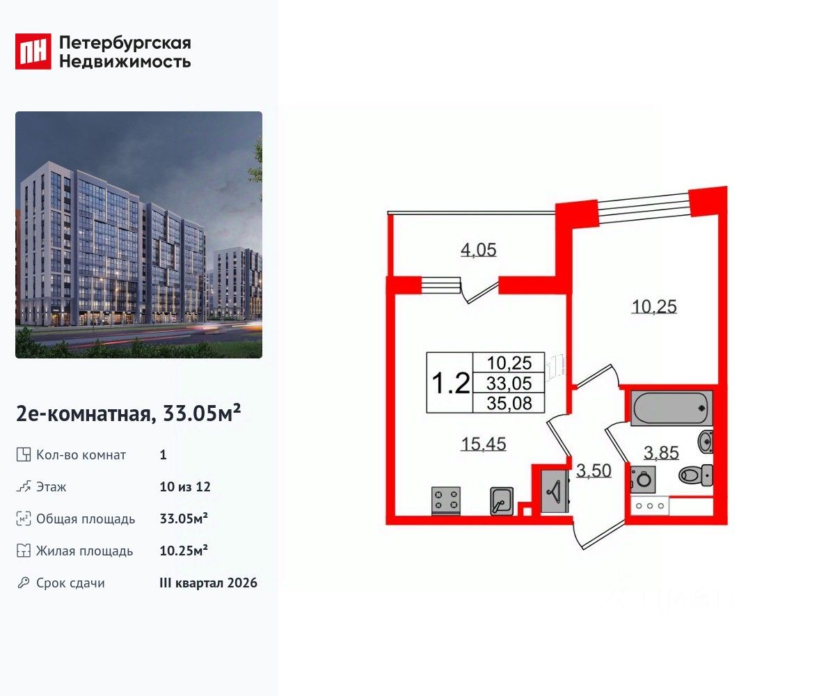 Удобная, классическая, функциональная европланировка, большая кухня-гостиная 15.45 м², вместительная прихожая 3.5 м². Общая площадь квартиры - 33.05 м², жилая 10.25 м², высота потолка 2.77 м.
