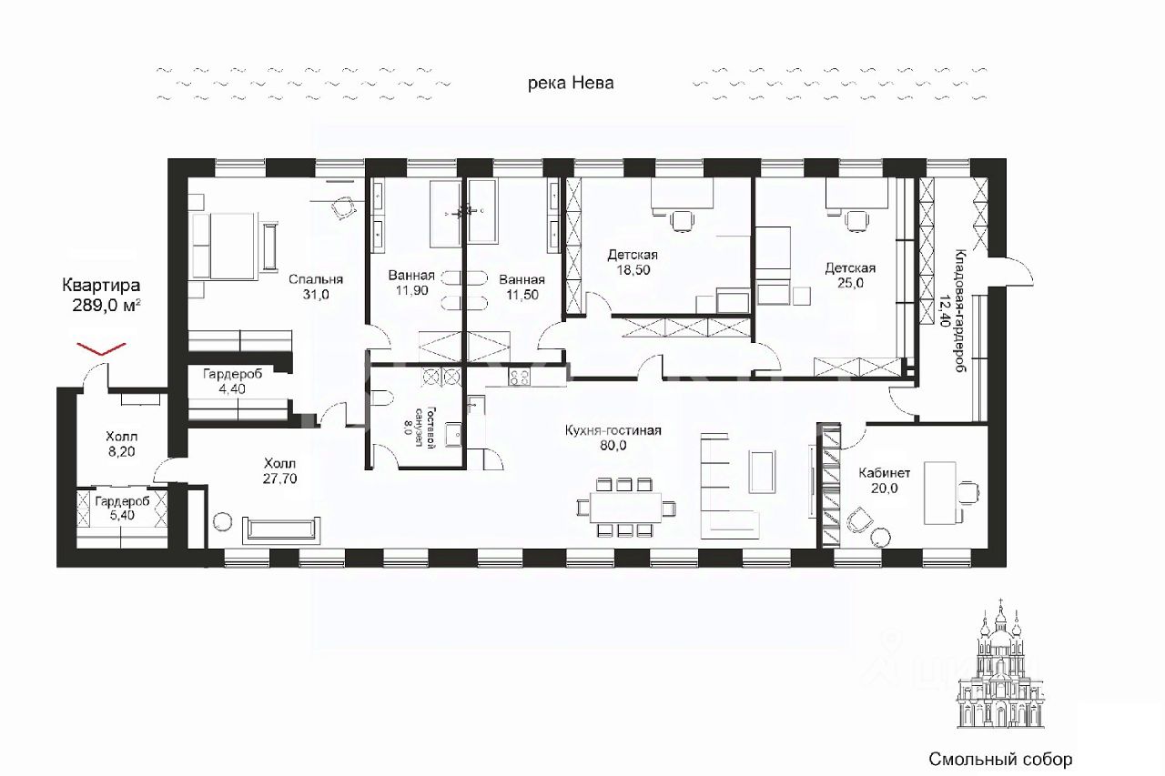 Предлагается к продаже видовая резиденция в жилом комплексе ''Смольный Парк'' под индивидуальное планировочное решение. Практичная двухсторонняя планировка для воплощения уютного семейного пентхауса, занимающего весь последний этаж в парадной. Виды из окон в сторону Смольного и набережной реки Невы. Благодаря двухсторонней планировке (по 9 окон на каждую сторону) на общей площади 289 кв. м, предполагается расположение от 3 до 5 спален, гостиного зала с кухней и обеденной зоной, три санузла (собственные для мастер-спальни и детских комнат), просторный холл-прихожая, вместительные подсобные/гардеробные помещения. Размещение на последнем этаже также открывает возможную опцию использования эксплуатируемой крыши над резиденцией в качестве открытой террасы (дополнительно около 300 кв. м).