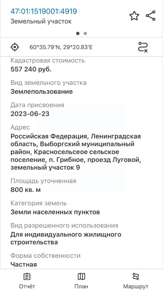 Кадастровый номер 47:01:1519001:4919 Категория земли - земли населенных пунктов Вид разрешенного использования - для индивидуального жилищного использования